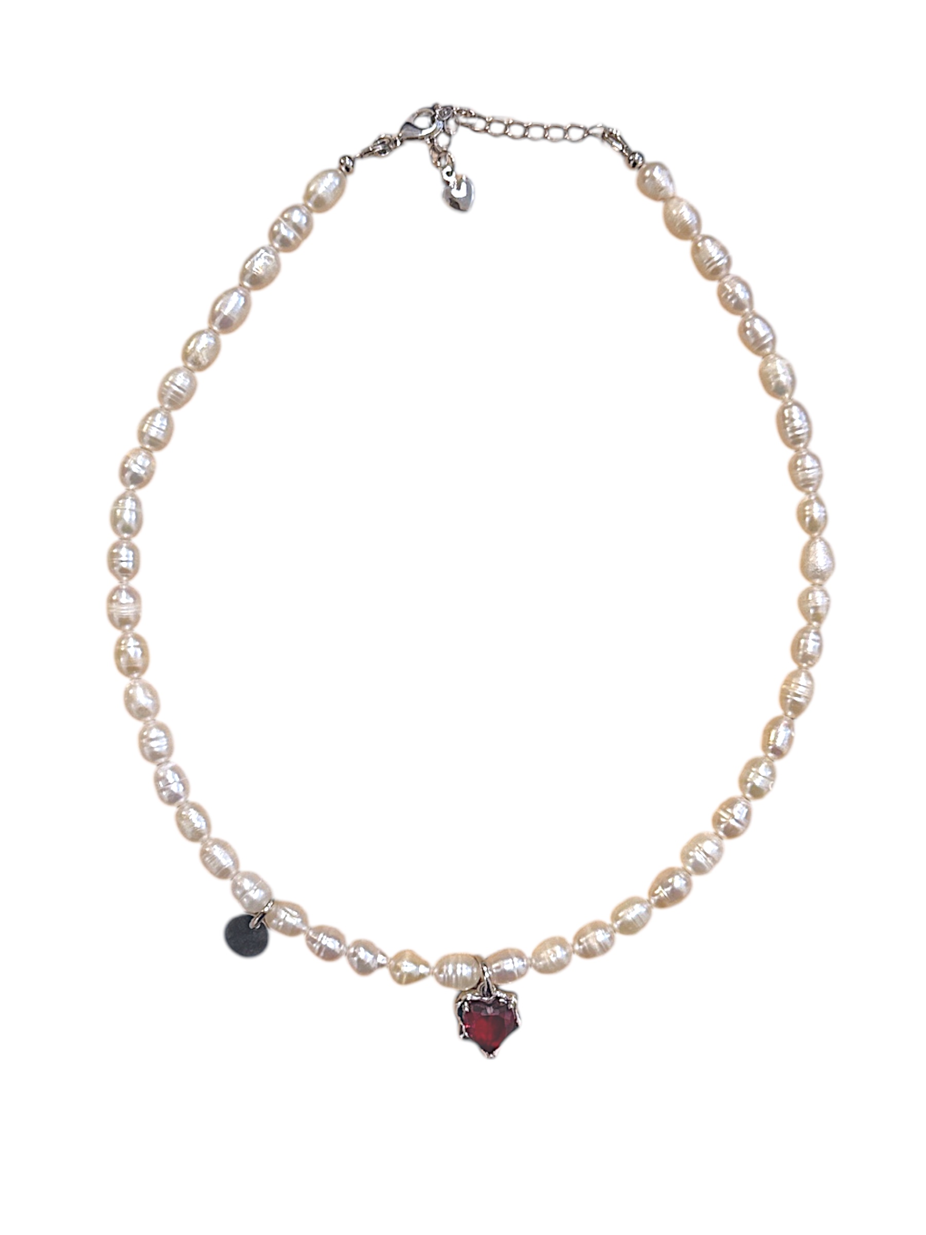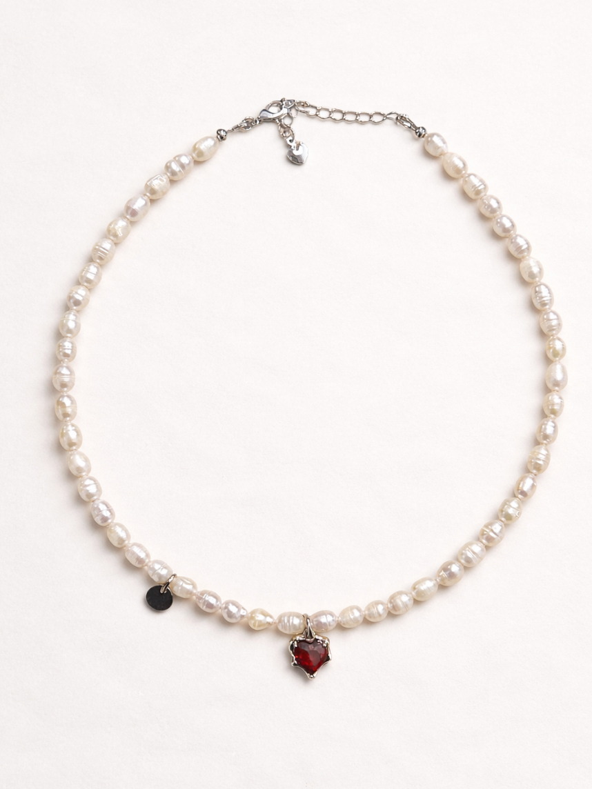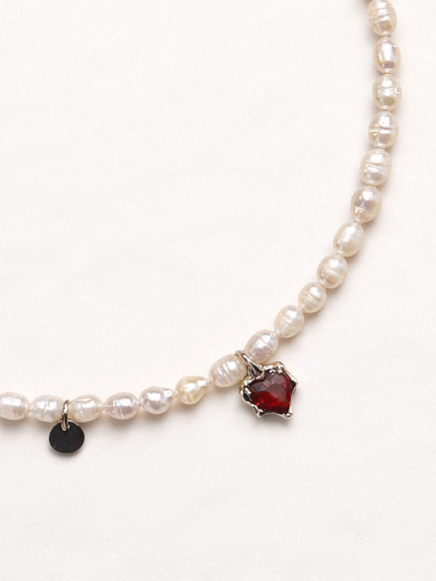 Чокер ручной работы «Ice» с красным сердцем, речной жемчуг, родированная латунь