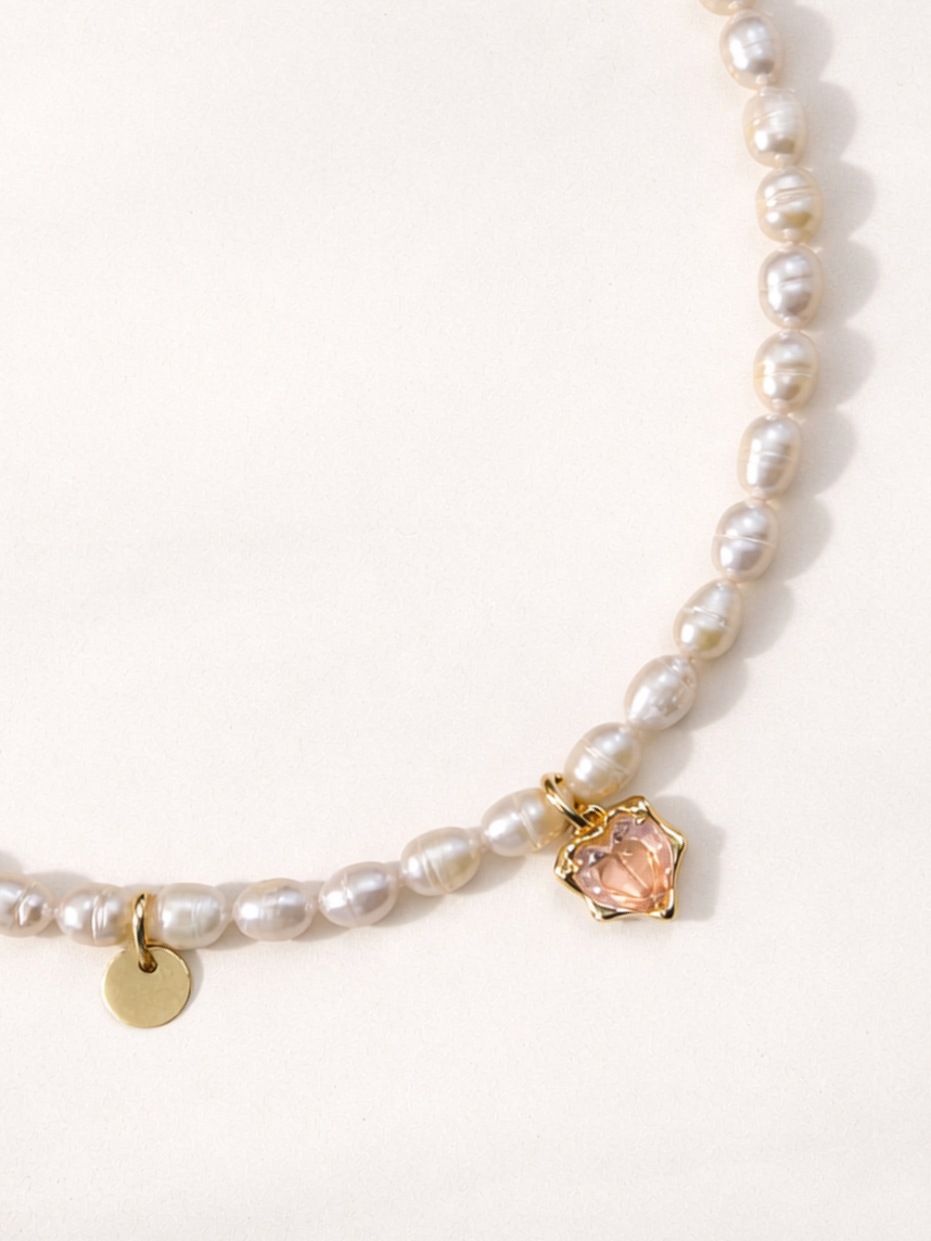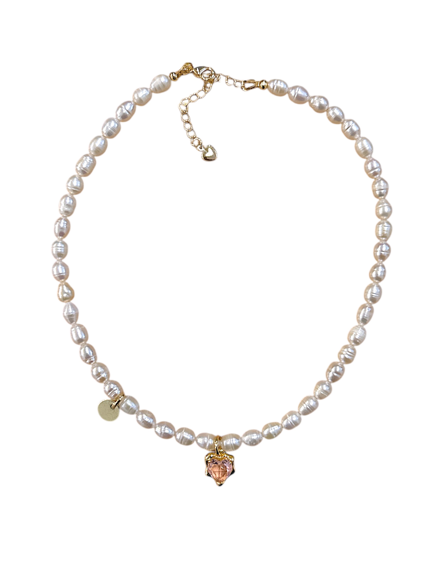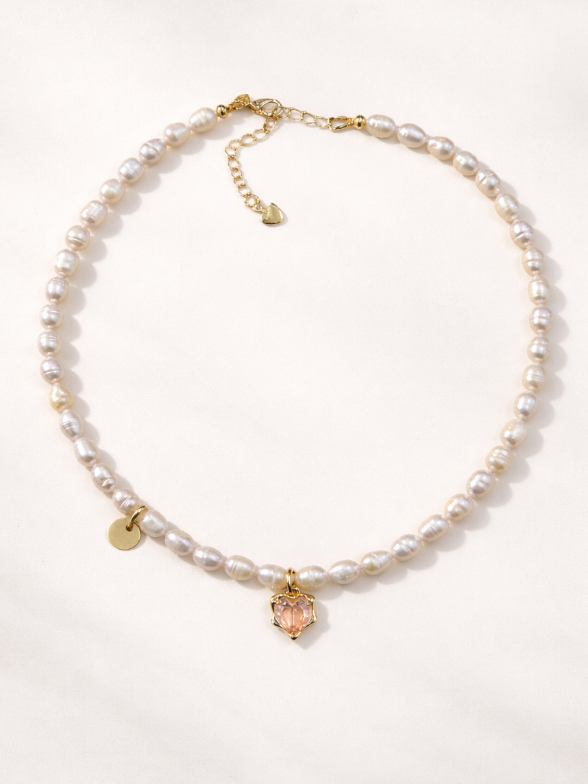 Чокер ручной работы «Ice» с розовым сердцем, речной жемчуг, родированная латунь