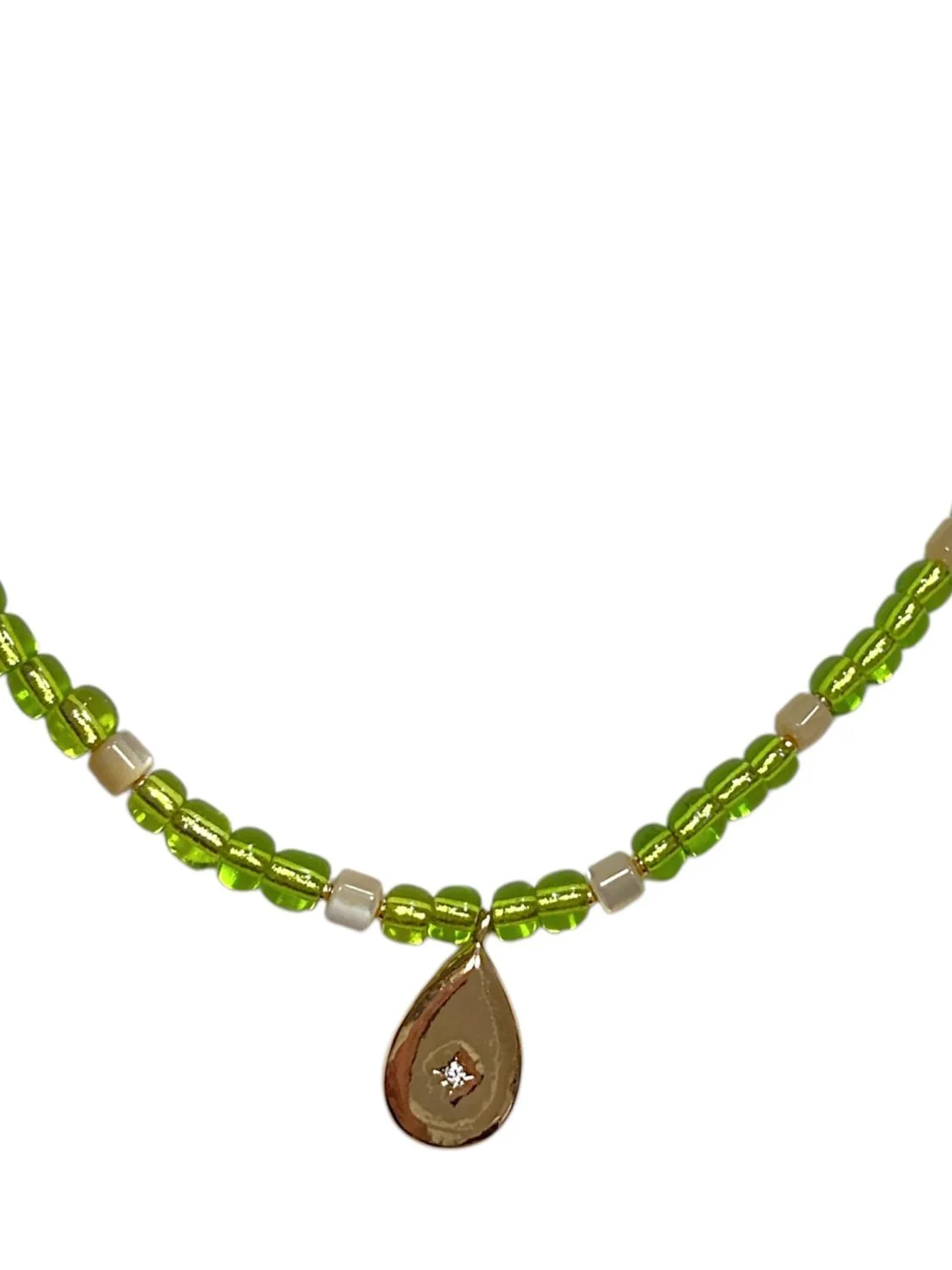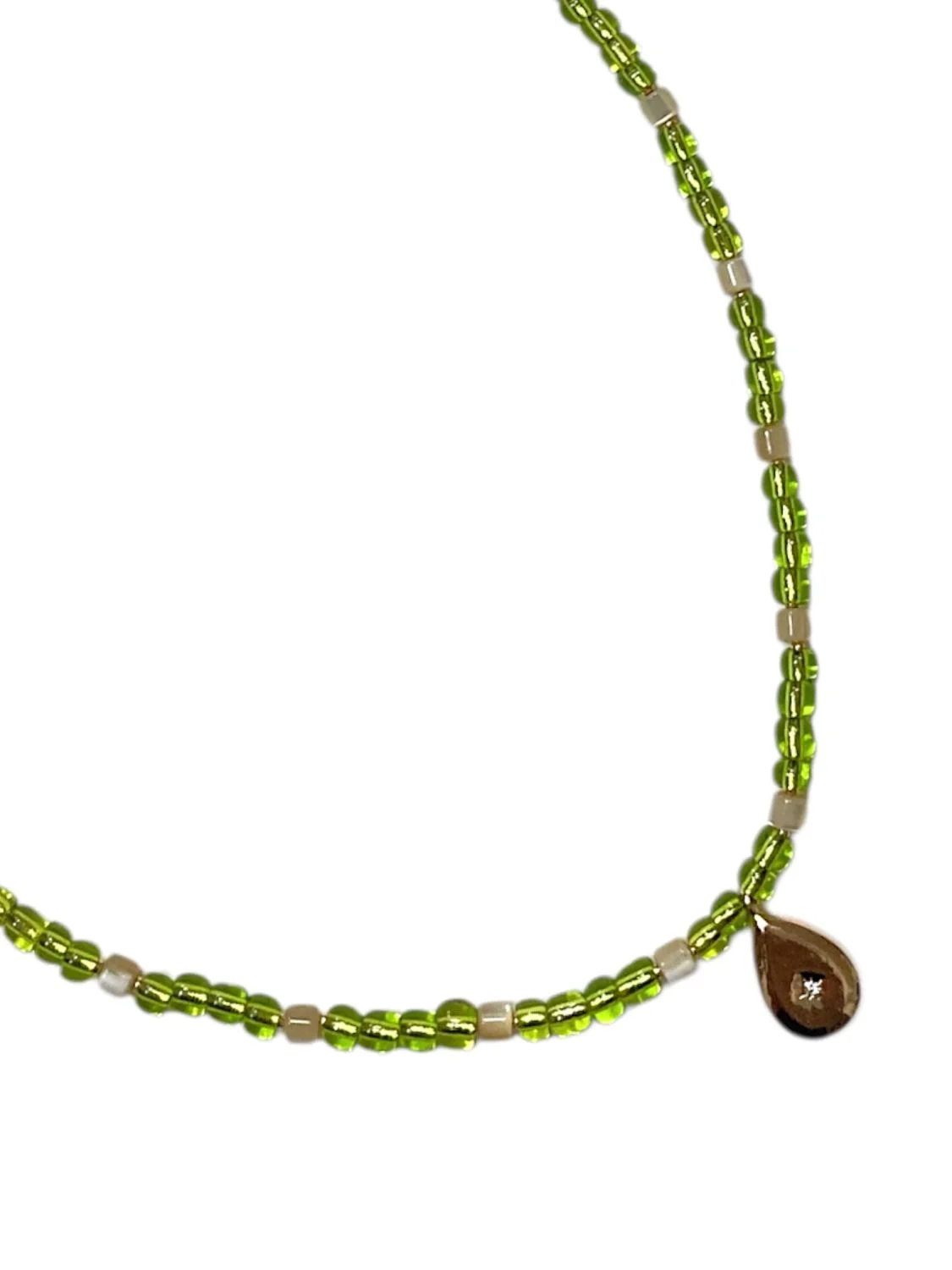 Чокер ручной работы из стеклянного бисера и бежевого перламутра с подвеской-каплей из латуни.