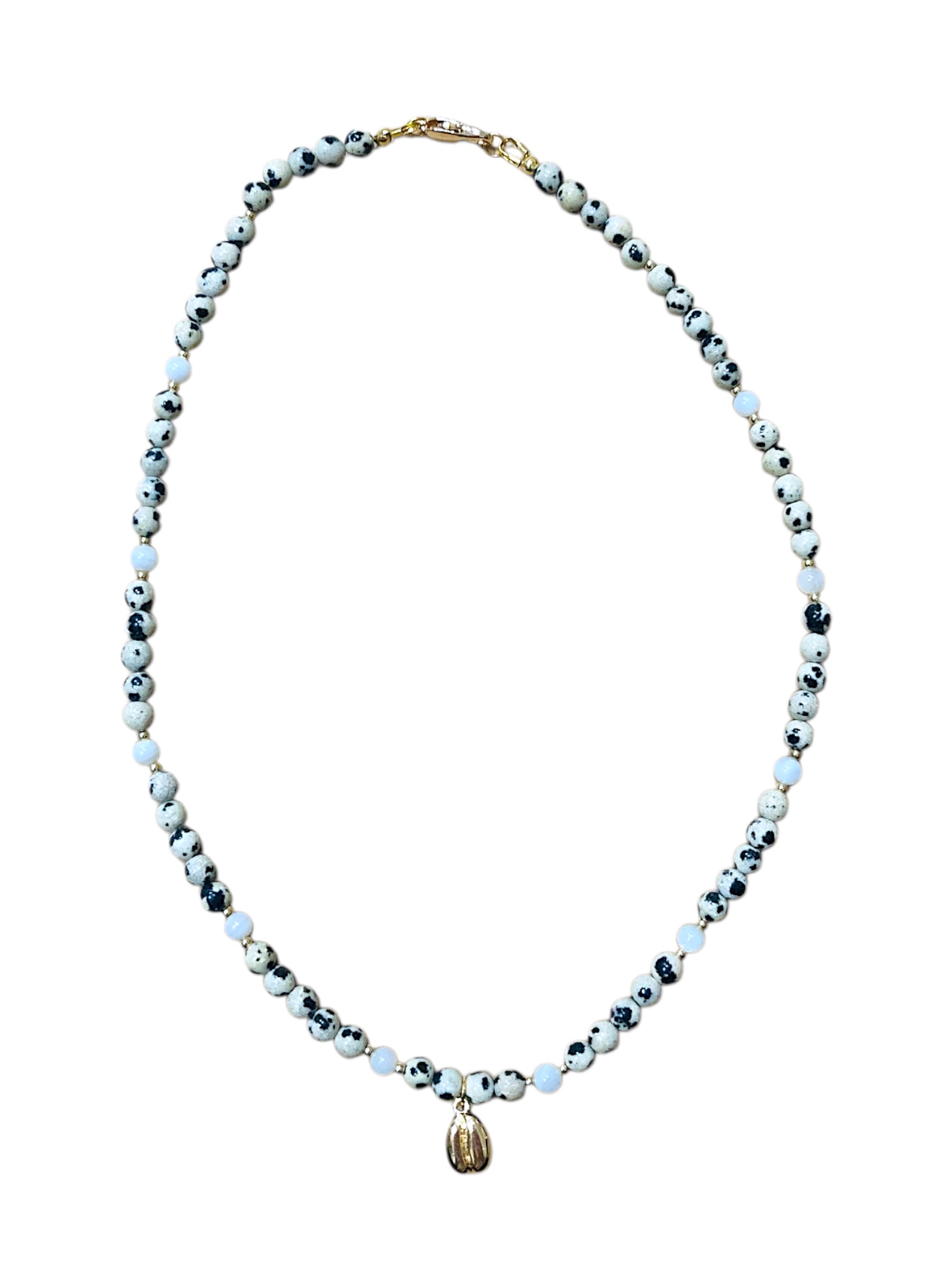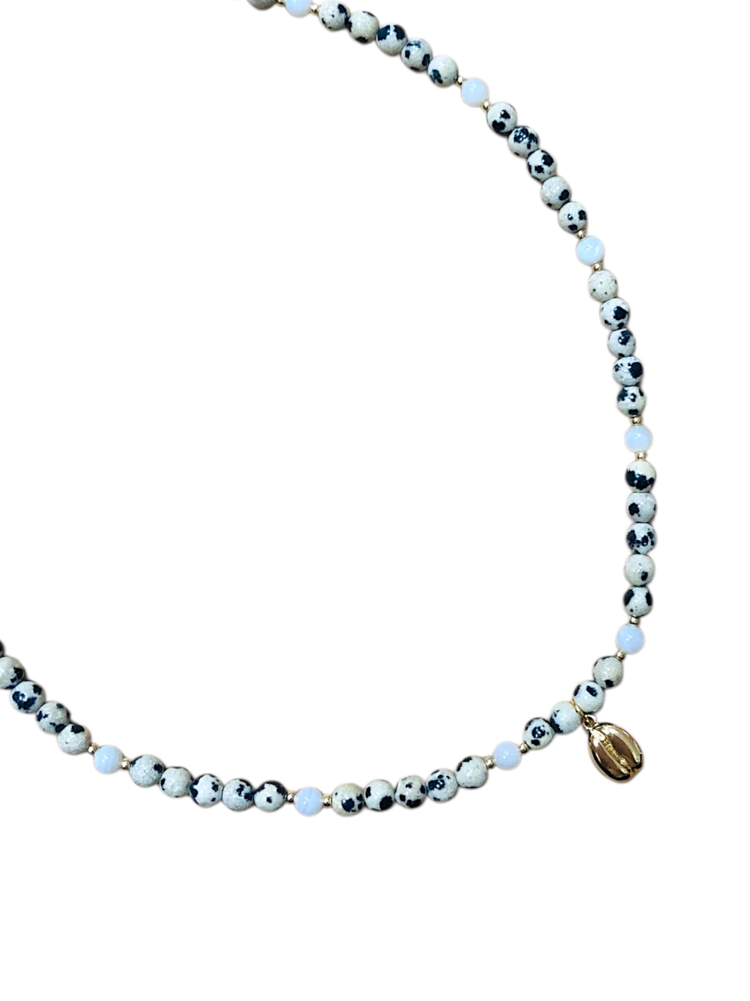Чокер ручной работы из перламутра, далматиновой яшмы и латунной подвески в форме кофейного зёрнышка.