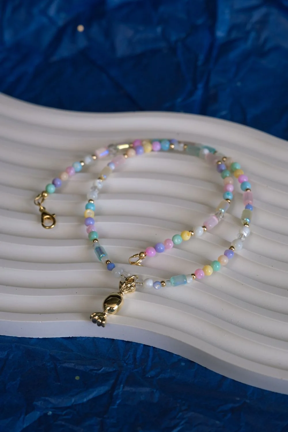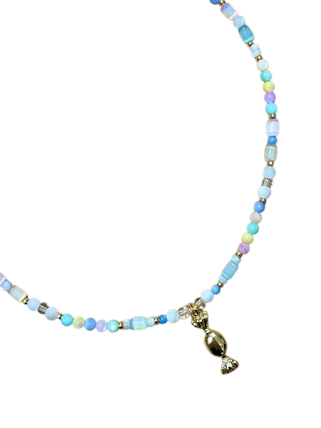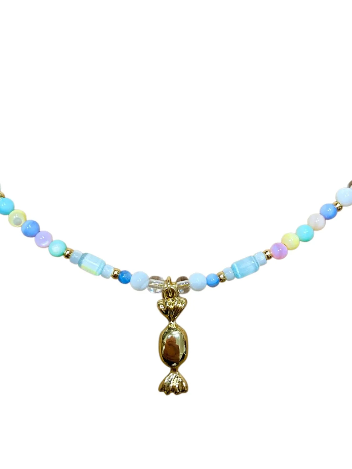 Чокер ручной работы из перламутра, стеклянного бисера и пластиковых бусин с подвеской-конфеткой из латуни.