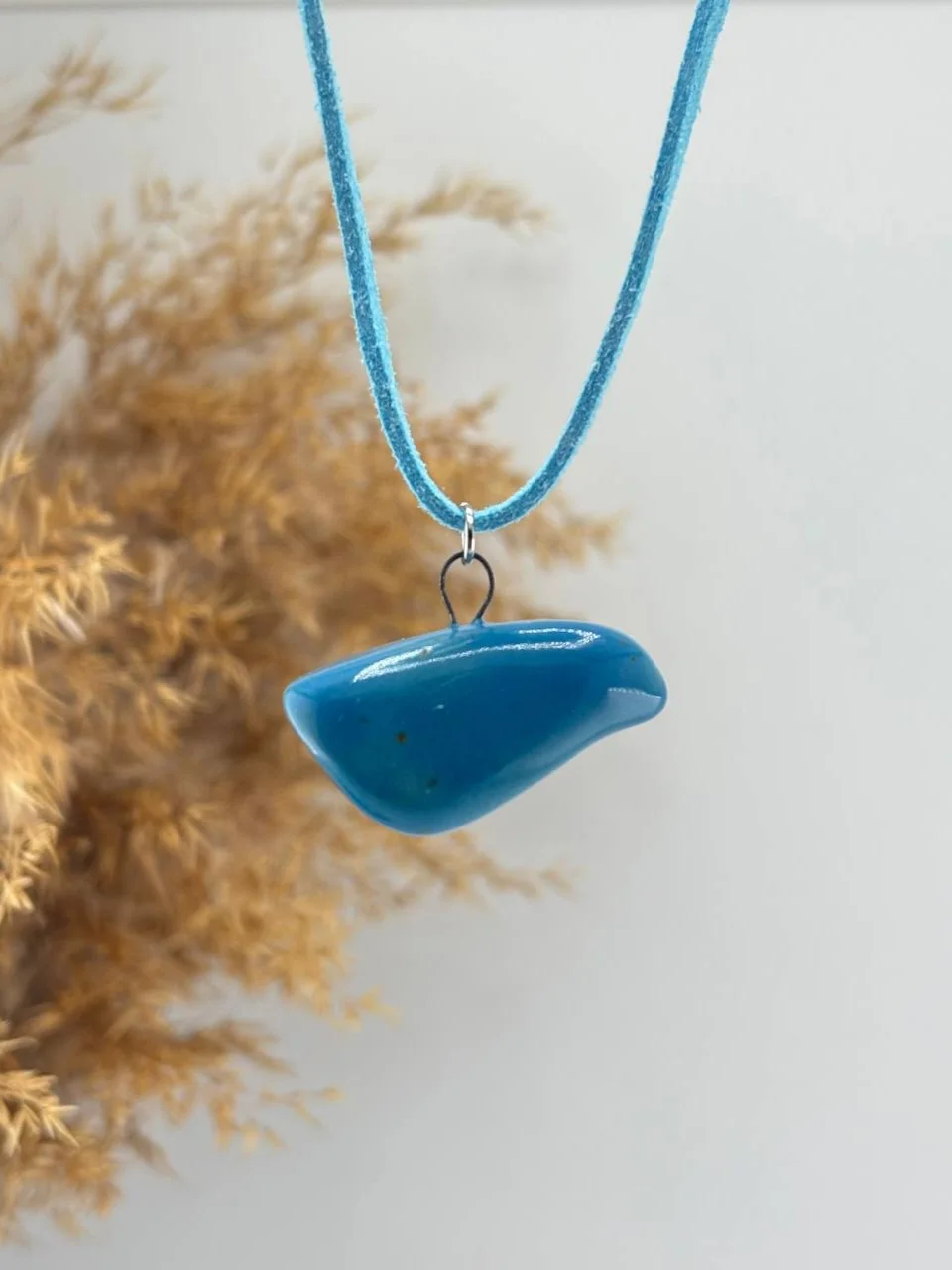 Модель выполнена на мягком голубом замшевом шнурке длиной около 145 см, который можно аккуратно обвязать вокруг шеи для комфортной посадки.