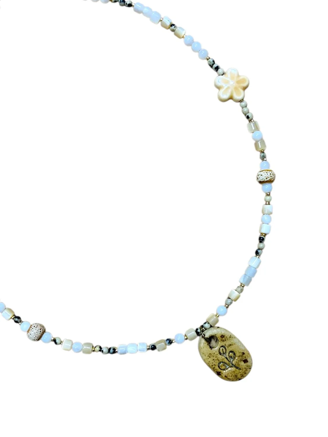 Чокер ручной работы из перламутра, далматиновой яшмы и керамики.