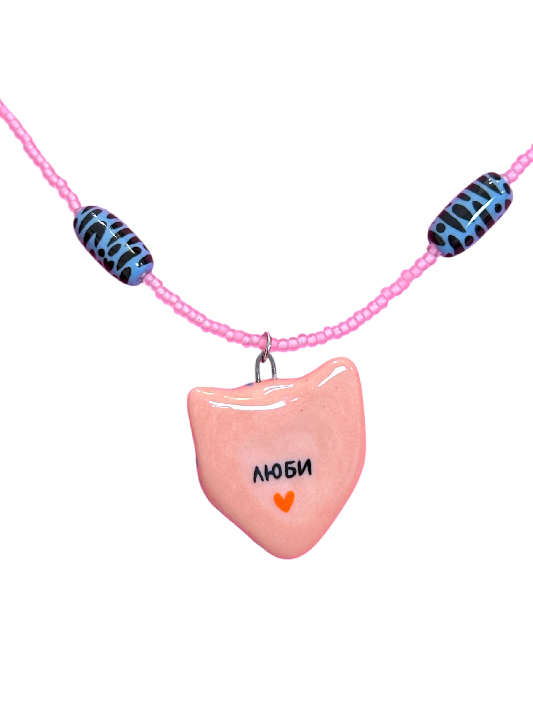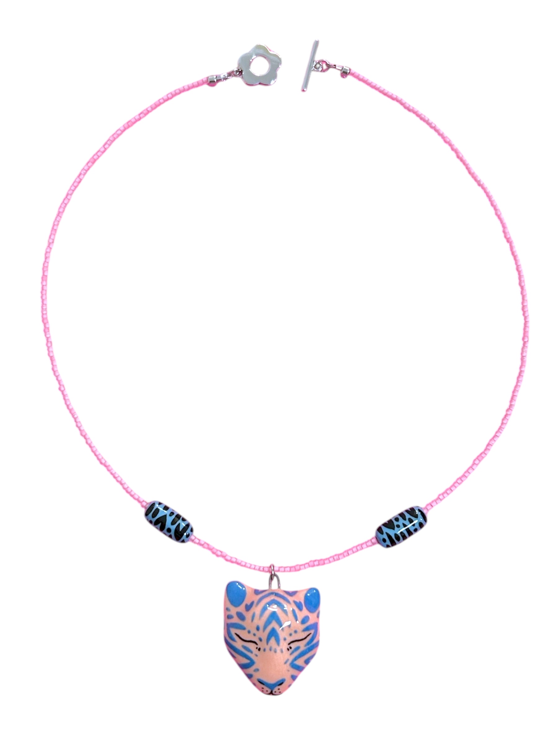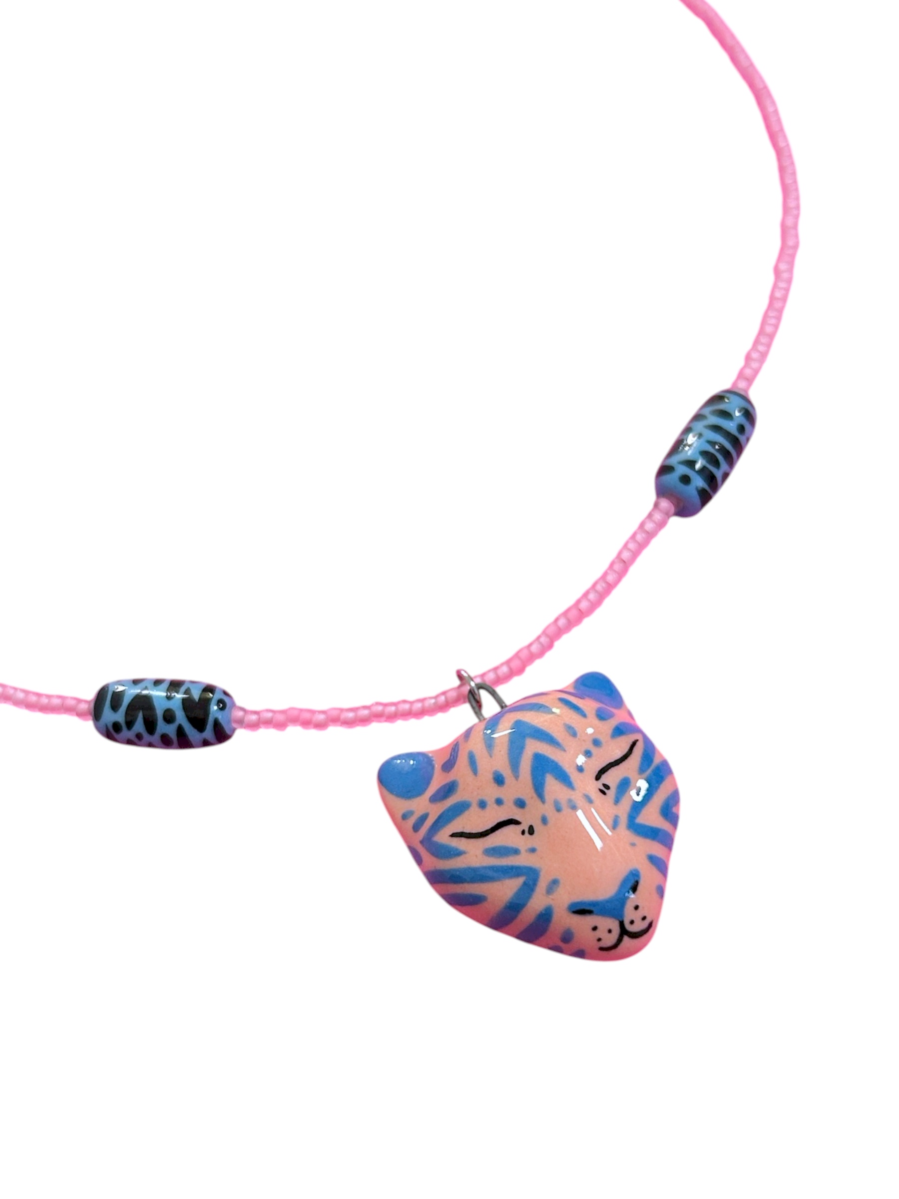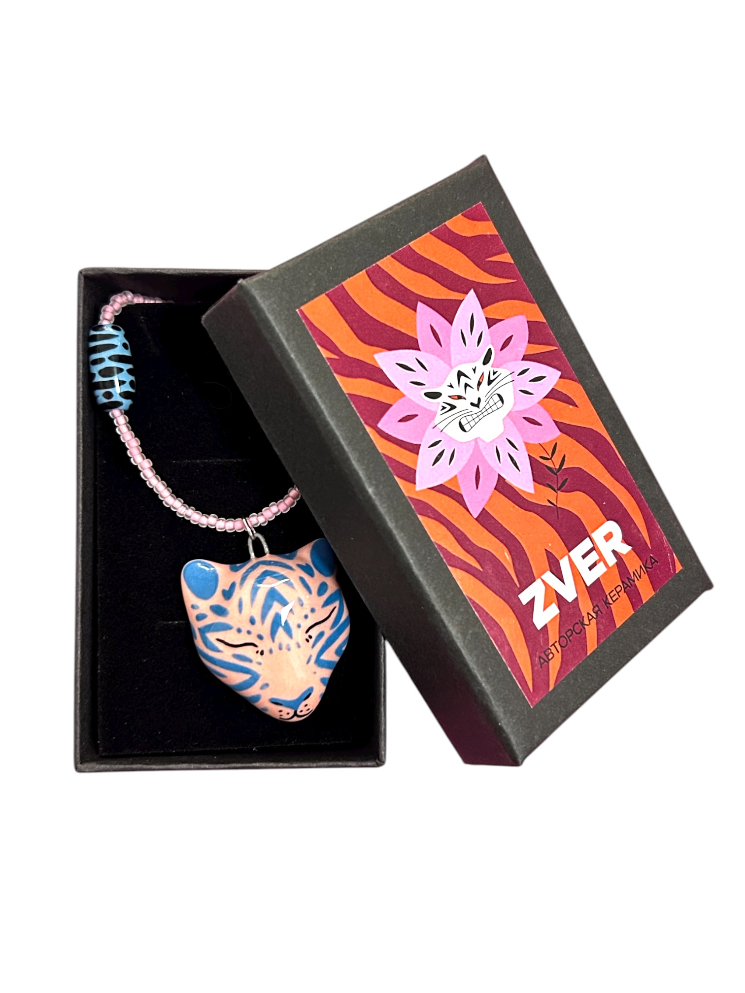 Чокер ручной работы с подвеской «Розовый тигр» и керамическими бусинами, бисер