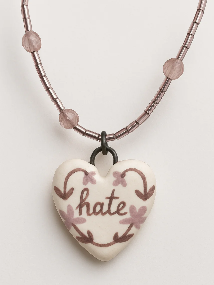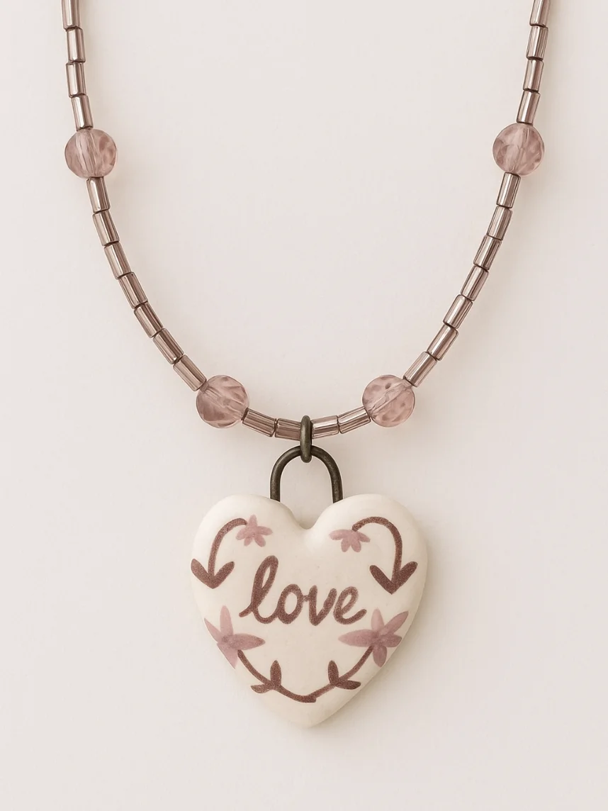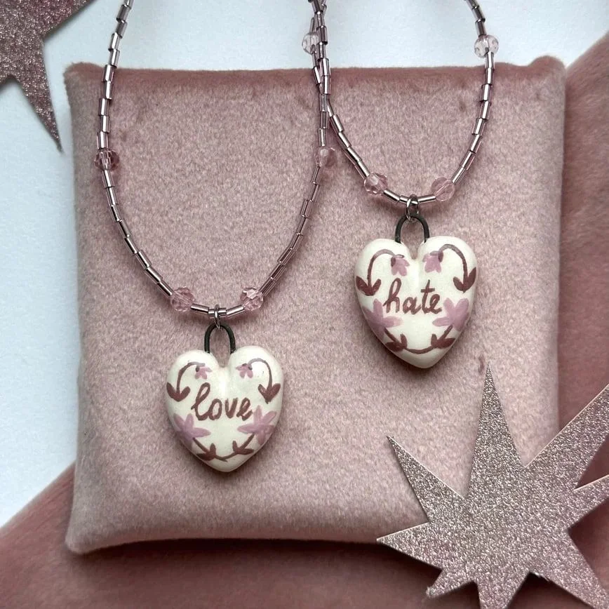 Чокер ручной работы Аннушка в виде сердечка «Love / Hate», двусторонний, керамика, бисер