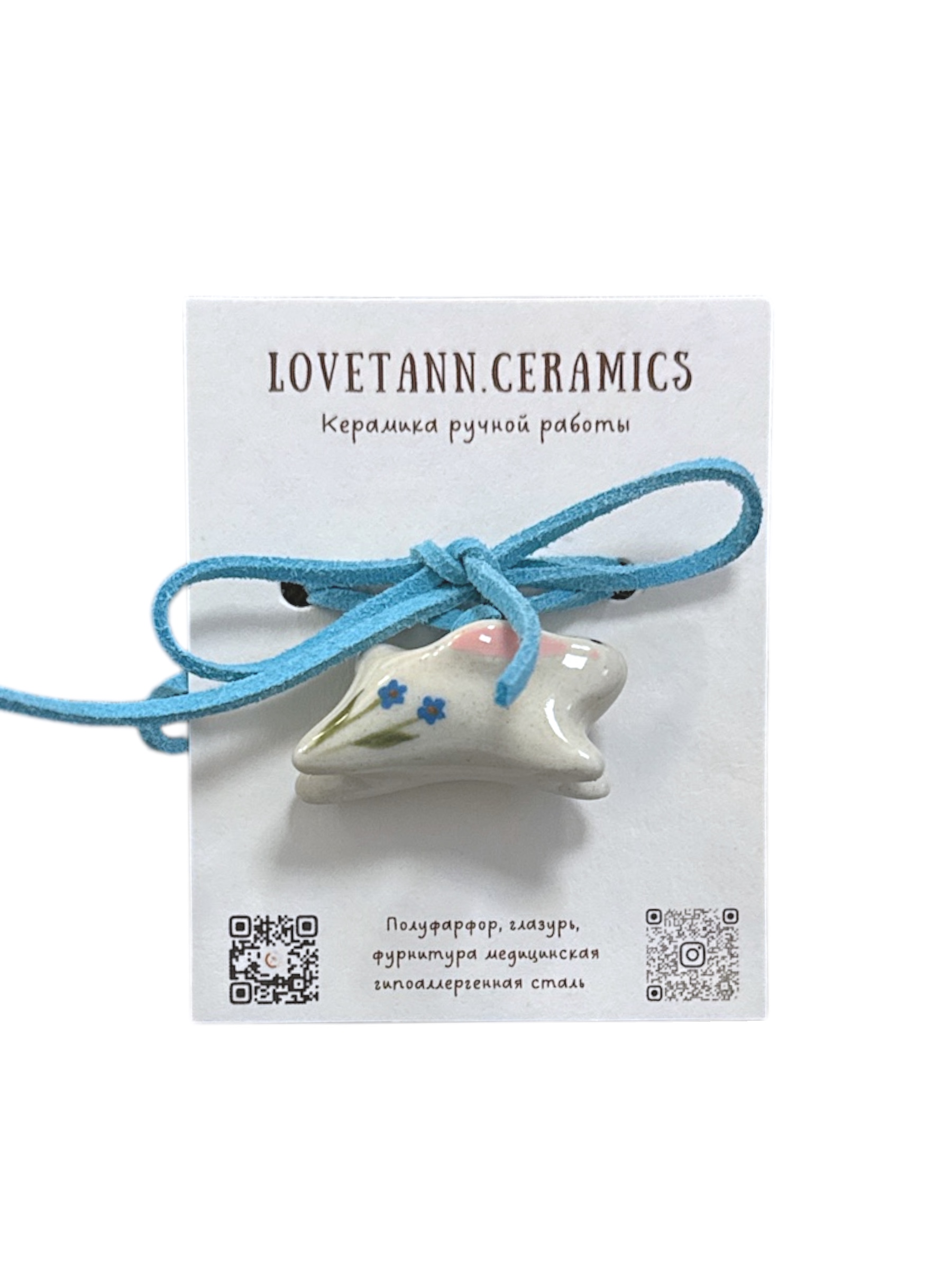 Чокер ручной работы «Зайка» с голубым цветочком, полуфарфор