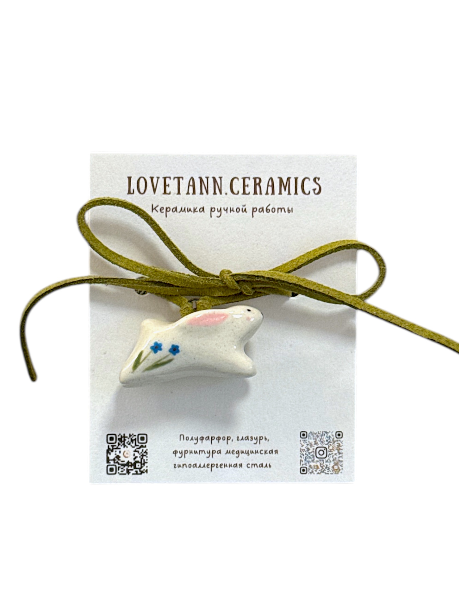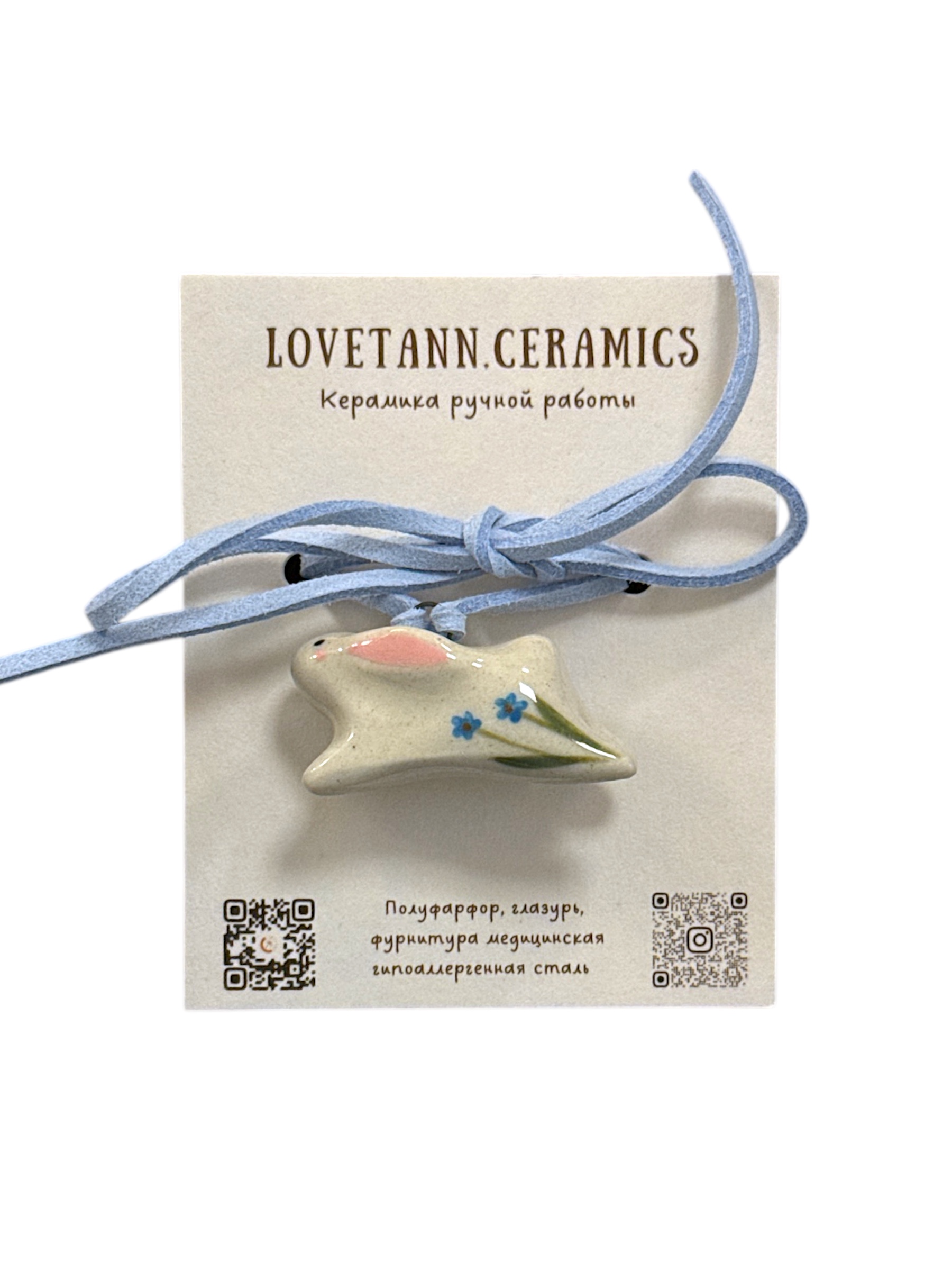 Чокер ручной работы «Зайка» с голубым цветочком, выполненный из полуфарфора.