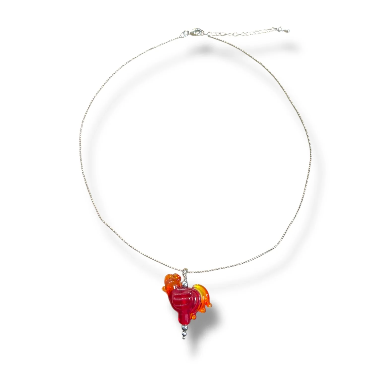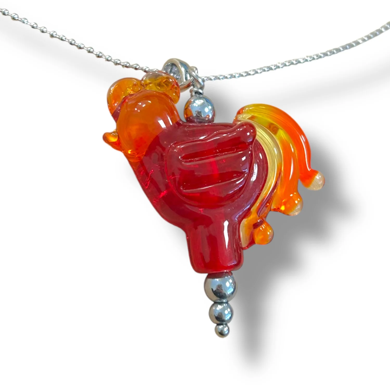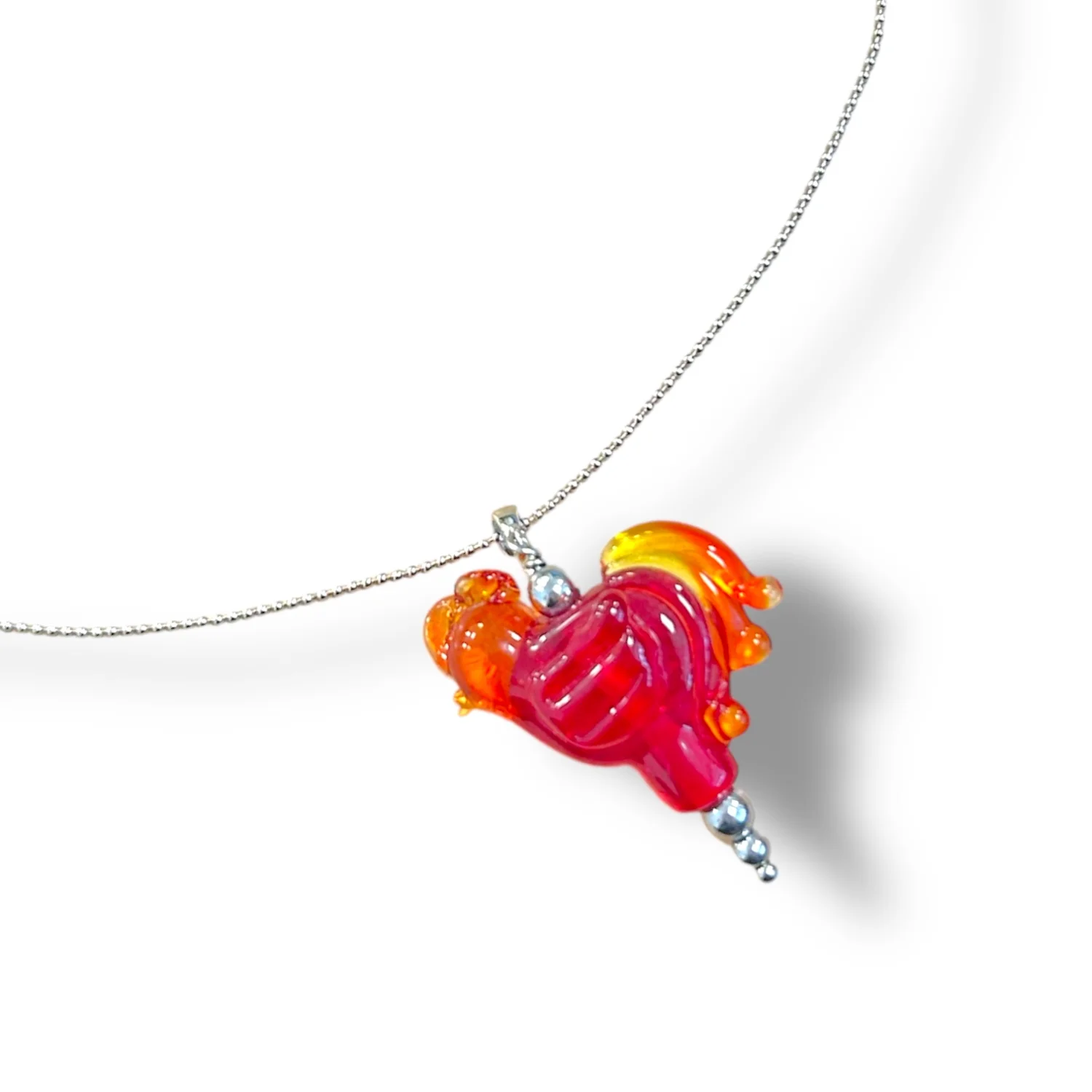 В центре композиции расположена изящная подвеска в виде петушка, выполненная из муранского стекла, известного своей насыщенной цветовой гаммой и уникальной текстурой.