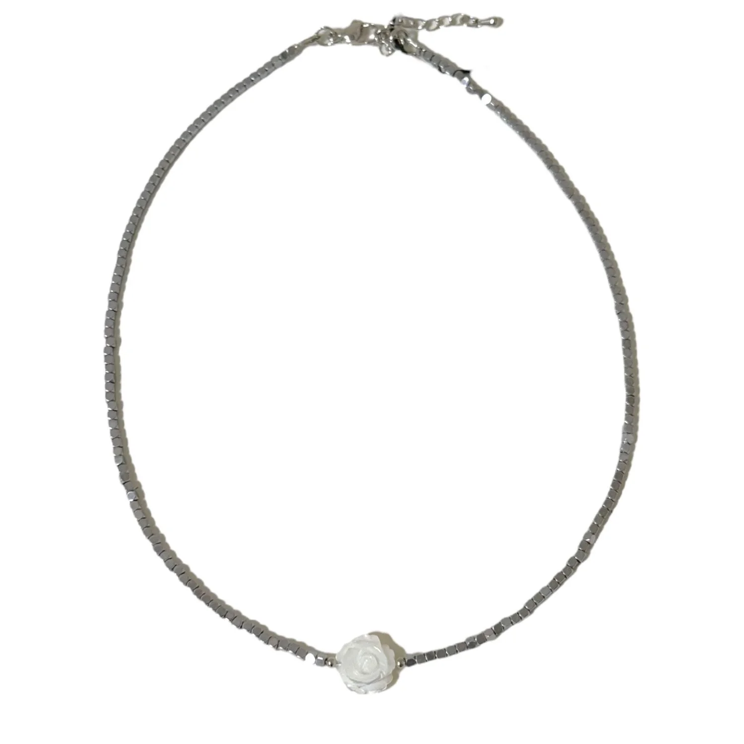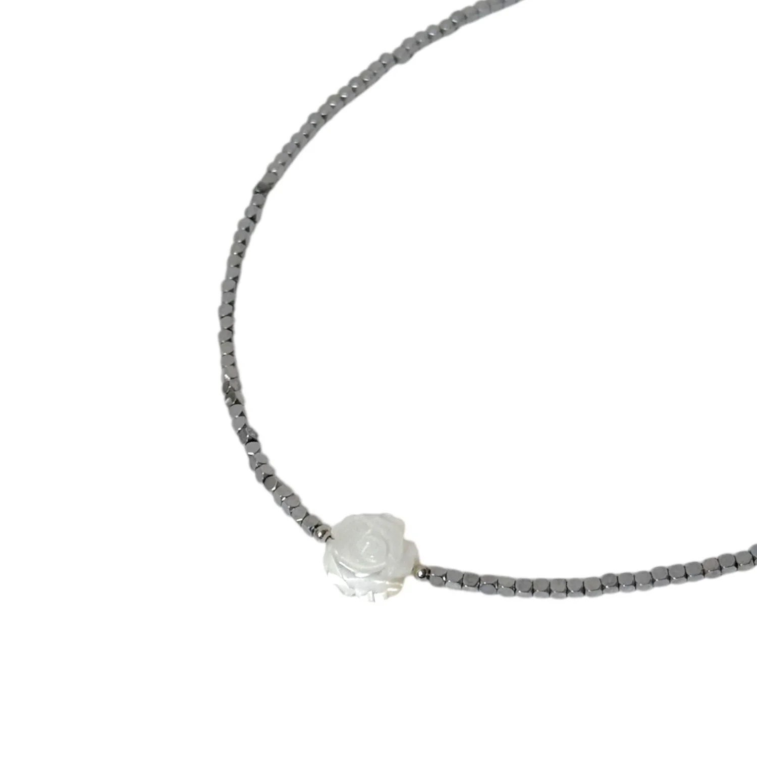 Чокер с подвеской из перламутра в виде розочки, выполненный из гематита.