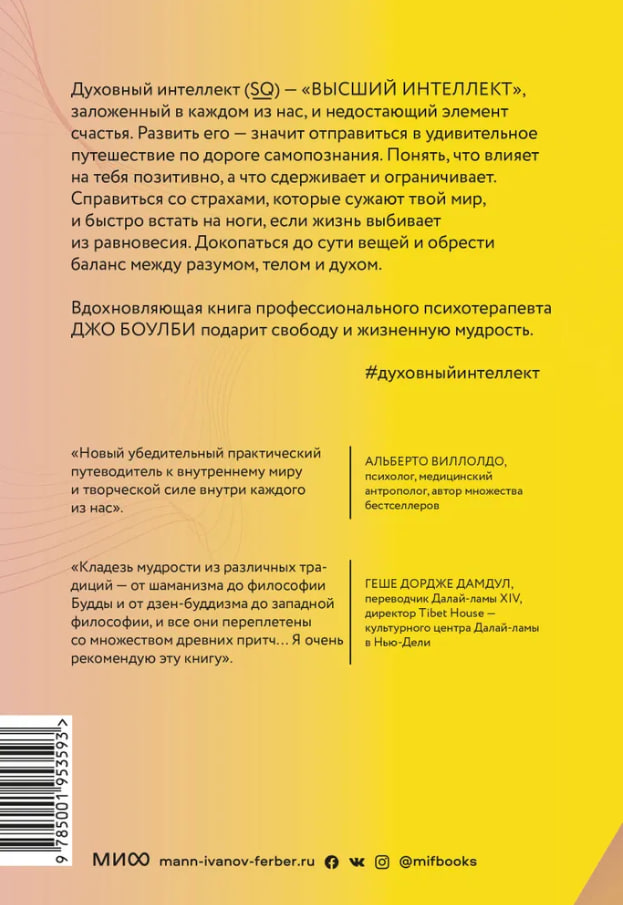 Люди с развитым духовным интеллектом способны более полно радоваться счастливым временам и с большей стойкостью переносить трудности. Психотерапевт Джо Боулби объясняет основы этого понятия и приглашает нас в увлекательное путешествие. Оно откроет грани нашей личности и поможет понять, что влияет на нас позитивно, а что сдерживает и ограничивает. Мы познакомимся с историями и страхами, которые сужают наш мир и делают его тусклее. Пока мы не уберем все это с пути, мы не увидим ничего, кроме границ реальности, установленных нами же.