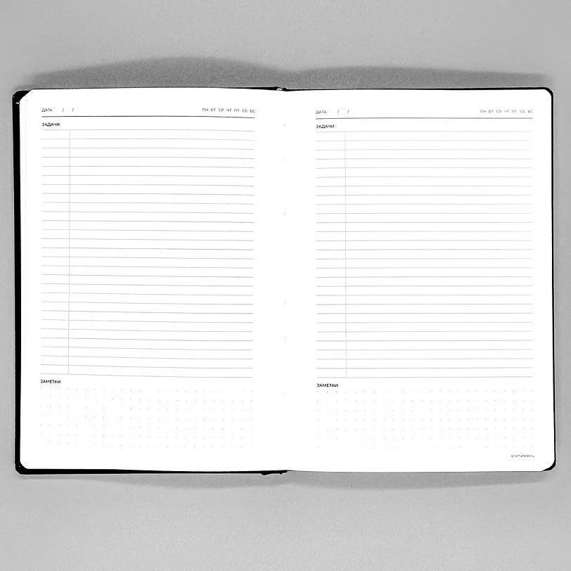 Планер недатированный, что позволяет вести его с любого дня и в любом формате. Разлинованные, белые и не просвечивающие листы обеспечат эстетическое удовольствие в использовании. Твёрдая обложка из черной текстурной эко-кожи, двойное ляссе-закладка, скругленные углы. Белая плотная и слегка шершавая бумага 120 гр/м2