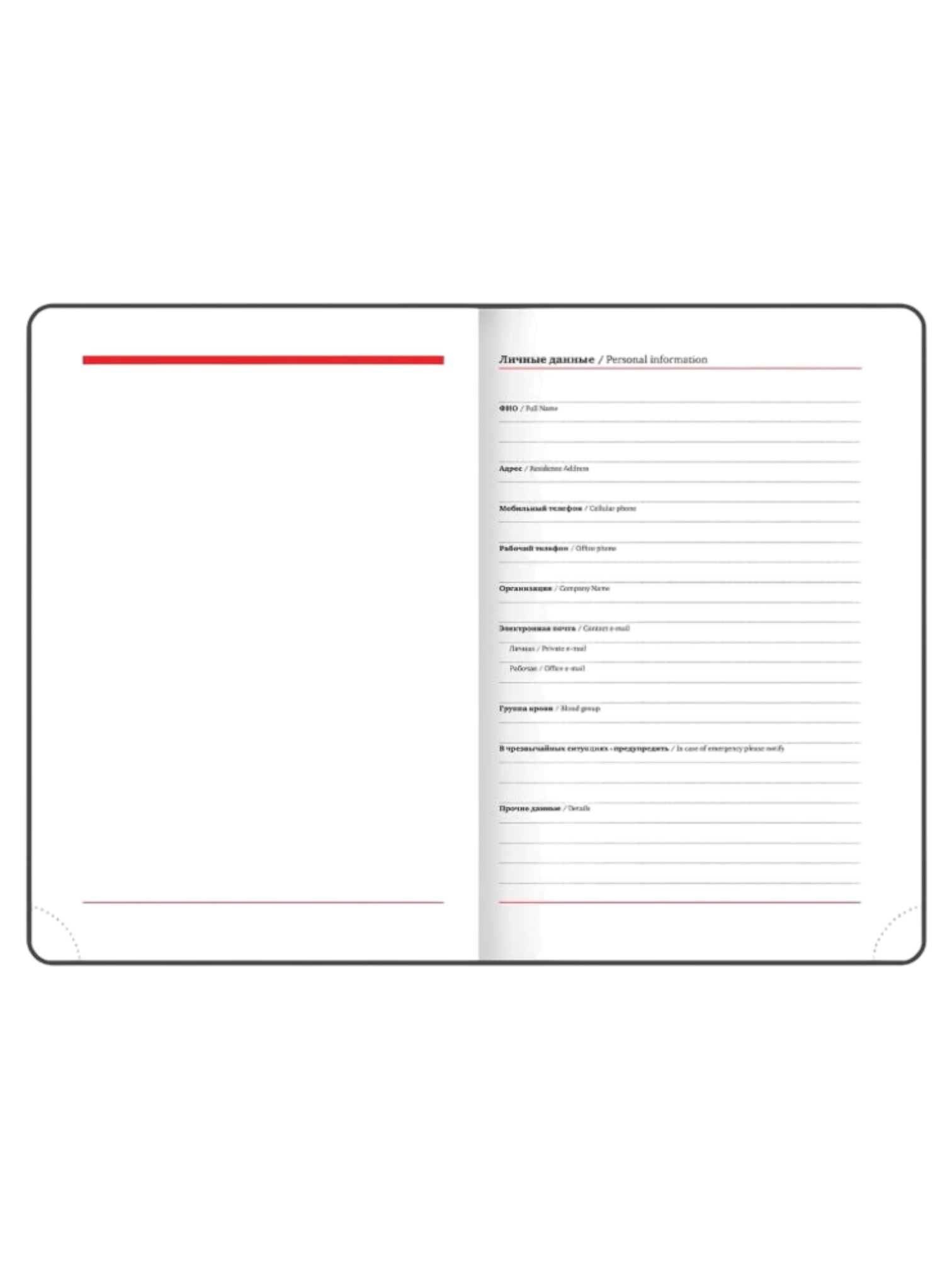 Срез и форзац ежедневника окрашены на контрасте с цветом обложки, что придает ему особый шарм. Дополнением является закладка-ляссе, с помощью которой при необходимости можно быстро открыть ежедневник на нужной странице. Помимо прочего ежедневник снабжен обширным справочным материалом. В конце ежедневника есть 3 страницы для записей и заметок.