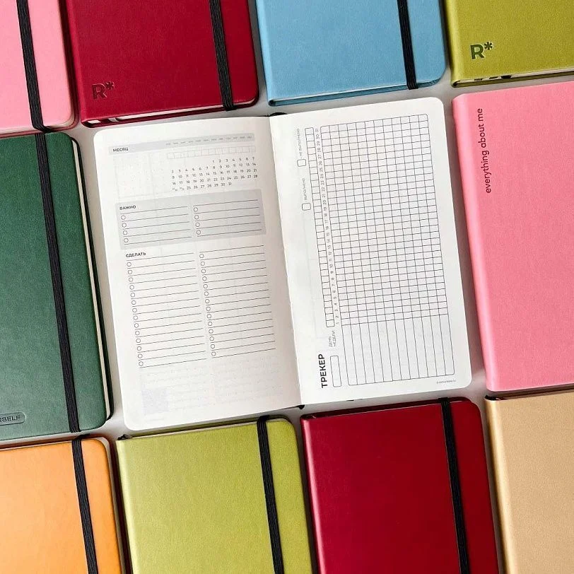 Еженедельник включает в себя список желаний, планы на год, колесо баланса списков книг, фильмов и интересных мест, а также планирование месяцев в расширенном формате с трекером привычек и планирование недель. Недельные развороты можно располагать в любом порядке.