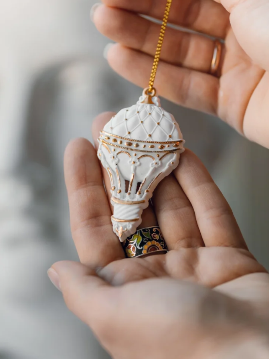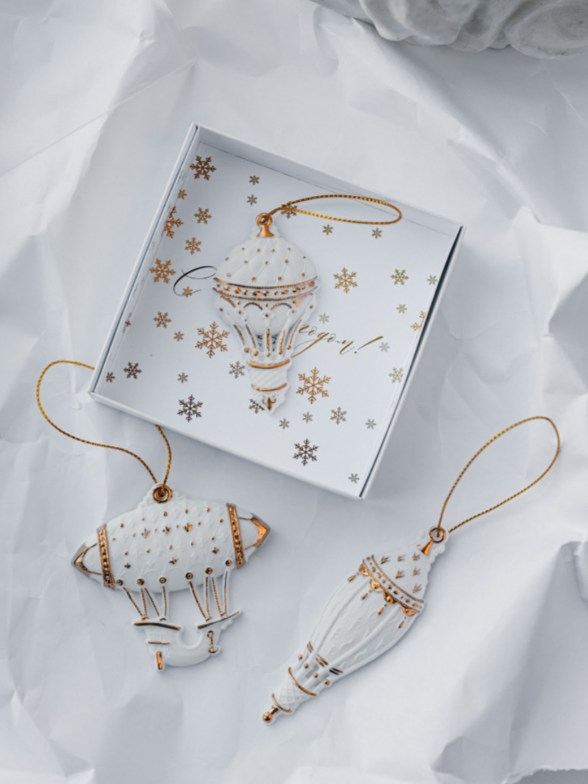 Игрушка новогодняя фарфоровая «Аэростат» бело-золотого цвета.
