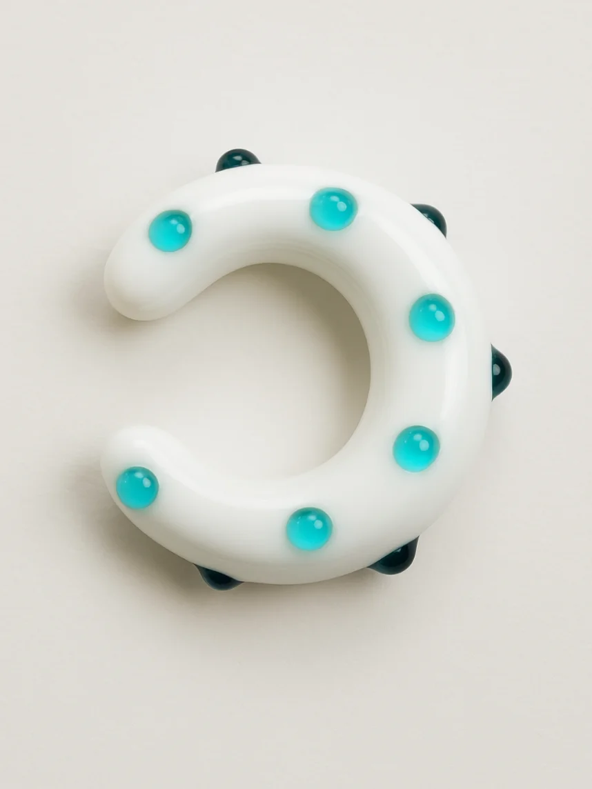 Яркое украшения на ухо, которое не требует прокола. Кафф создается вручную в пламени горелки, а затем проходят отжиг в муфельной печи, чтобы стать прочнее. Так как украшения создаются из стекла в свободной технике, без использования форм, точный повтор невозможен, и всегда будут небольшие отличия.