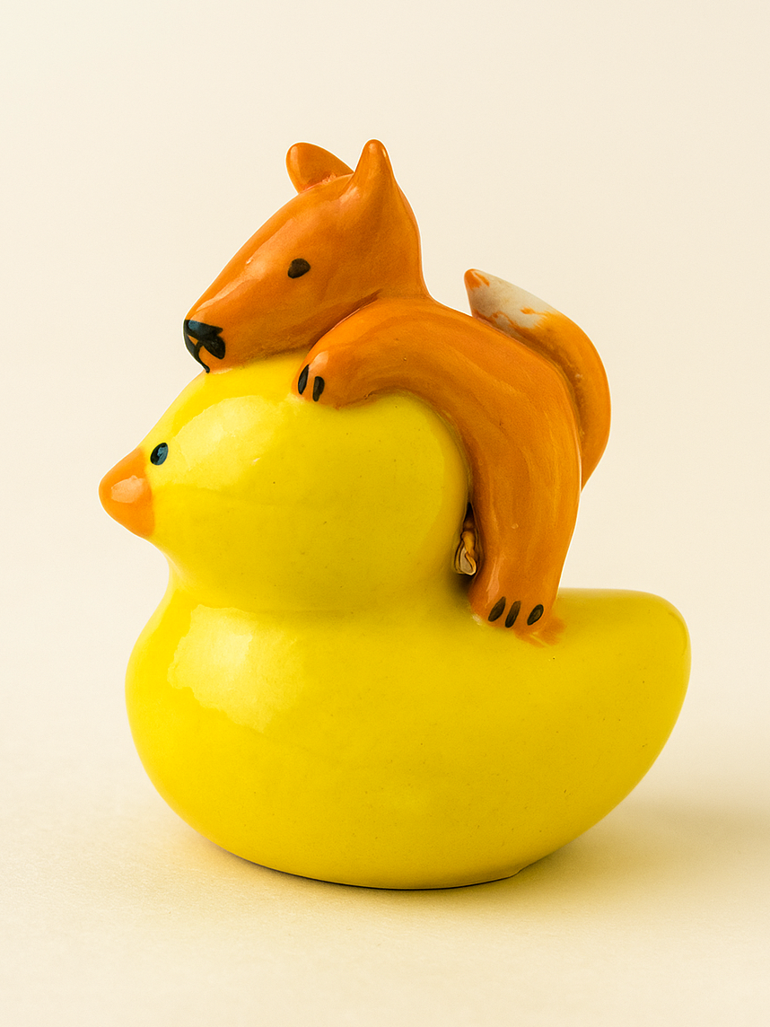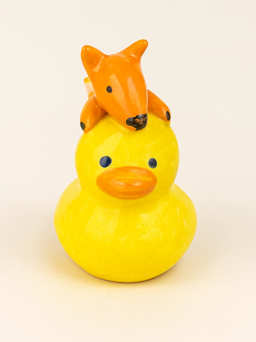 Керамическая фигурка "Уточка с лисёнком" — это милое и очаровательное декоративное изделие. На ней изображены уточка и маленький лисёнок, который небрежно повис на голове уточки. Размер фигурки около 6-8 см, она выполнена вручную с тщательной проработкой деталей и окраской, что делает каждую уникальной. Такая фигурка отлично подойдет для украшения интерьера, подарка или коллекционного украшения для любителей животных и милых сцен.