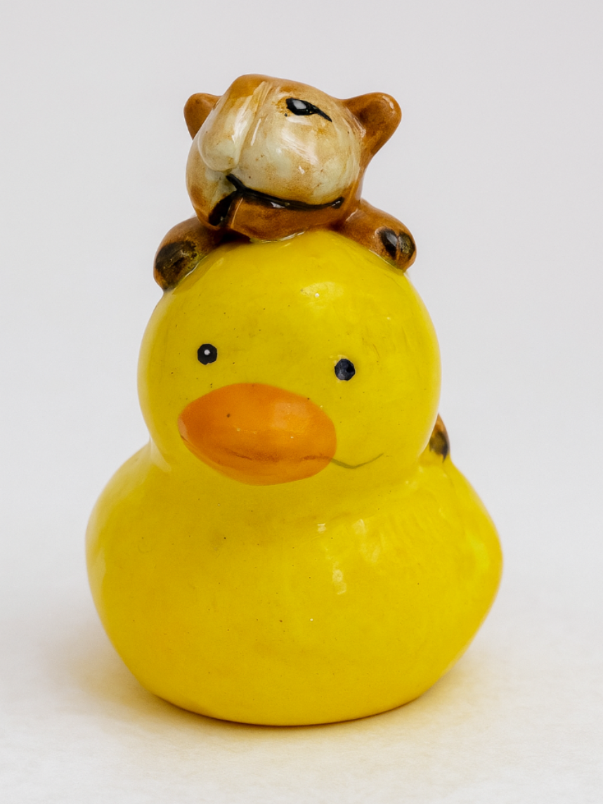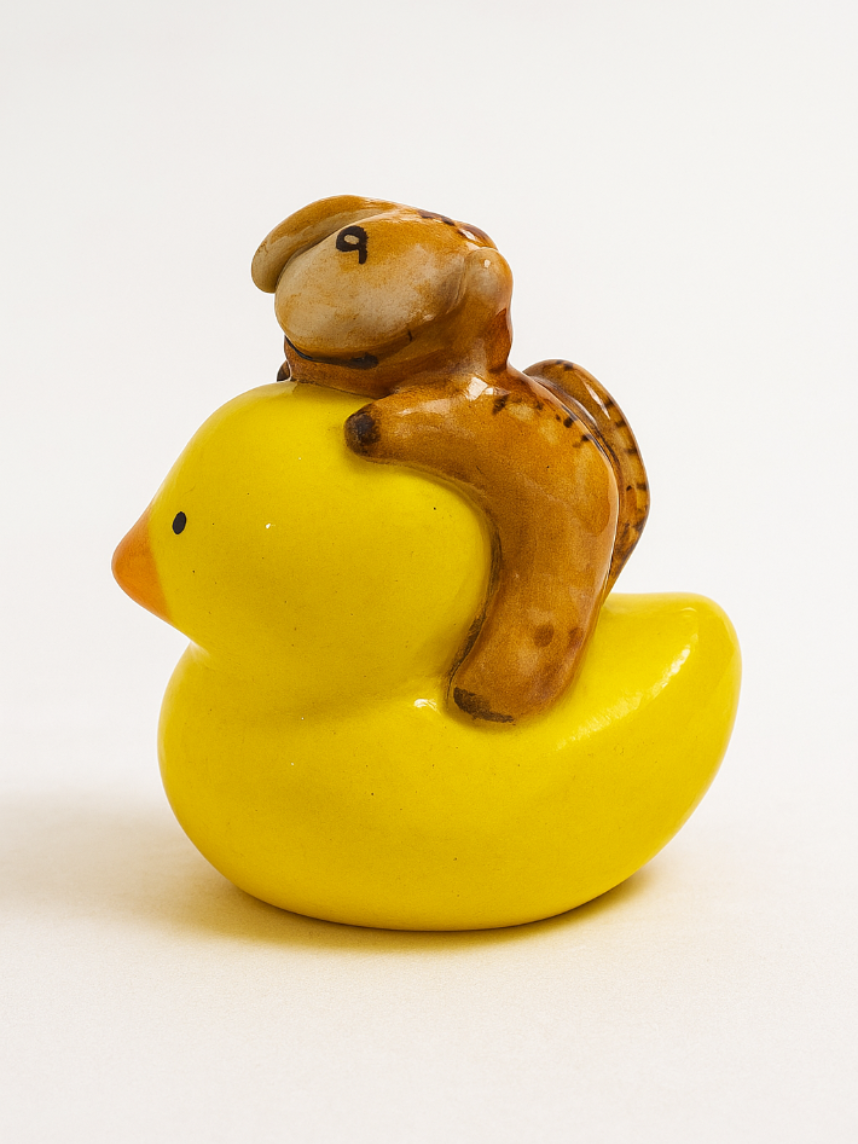 Керамическая фигурка "Уточка с тигром" — это забавное и оригинальное художественное изделие. В ней изображена уточка, на которой неожиданно висит маленький тигр, создавая игривый и милый сценический образ. Такой дизайн подчеркивает юмор и креативность, делая фигурку привлекательной для любителей необычных сувениров. Размер примерно 6-8 см, выполнена вручную с вниманием к деталям, что делает каждую фигурку уникальной. Отличный подарок и яркое украшение для интерьера.