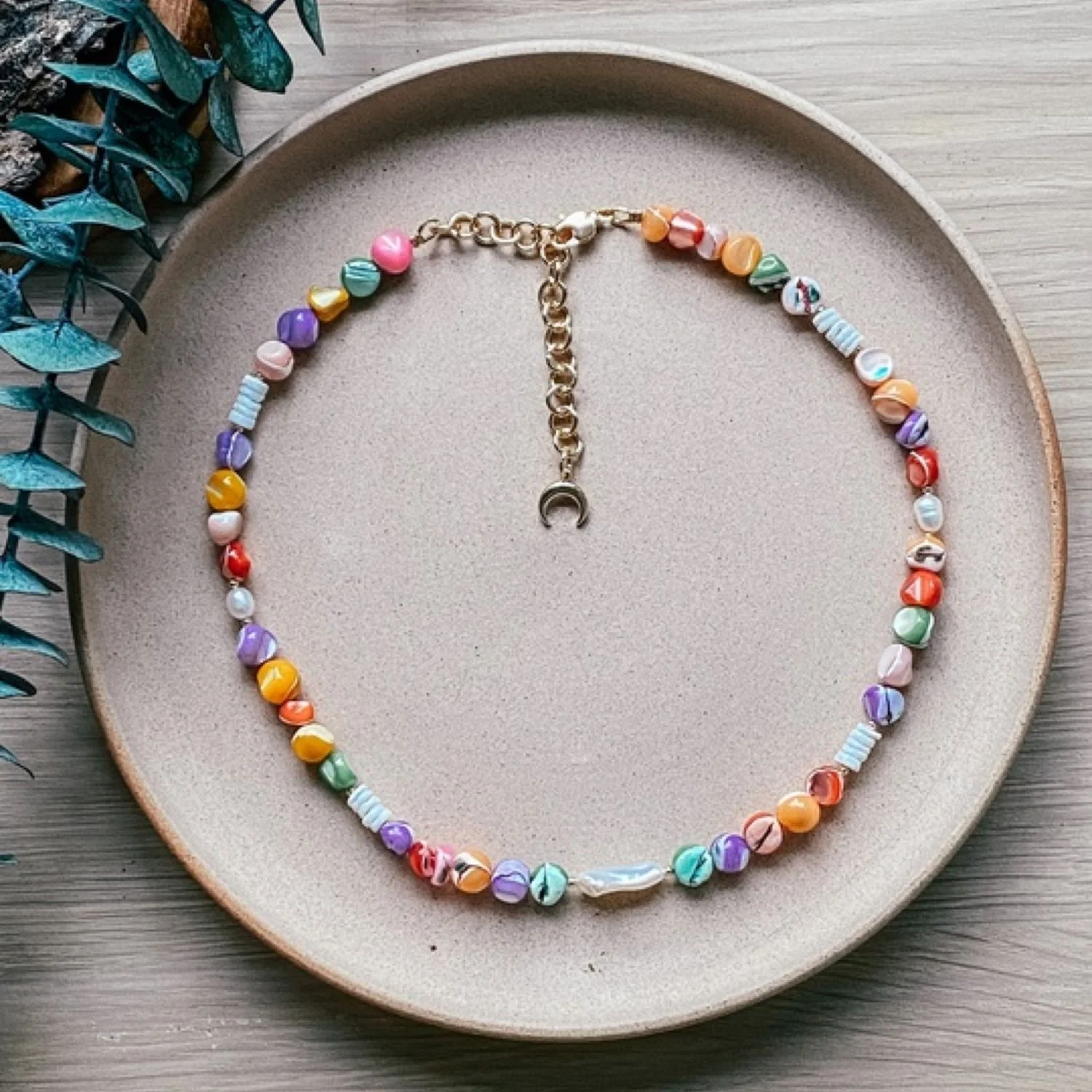 Колье «Paints 2», выполненный из цветного перламутра, ракушки, речного жемчуга и ювелирного сплава латуни с позолотой.
