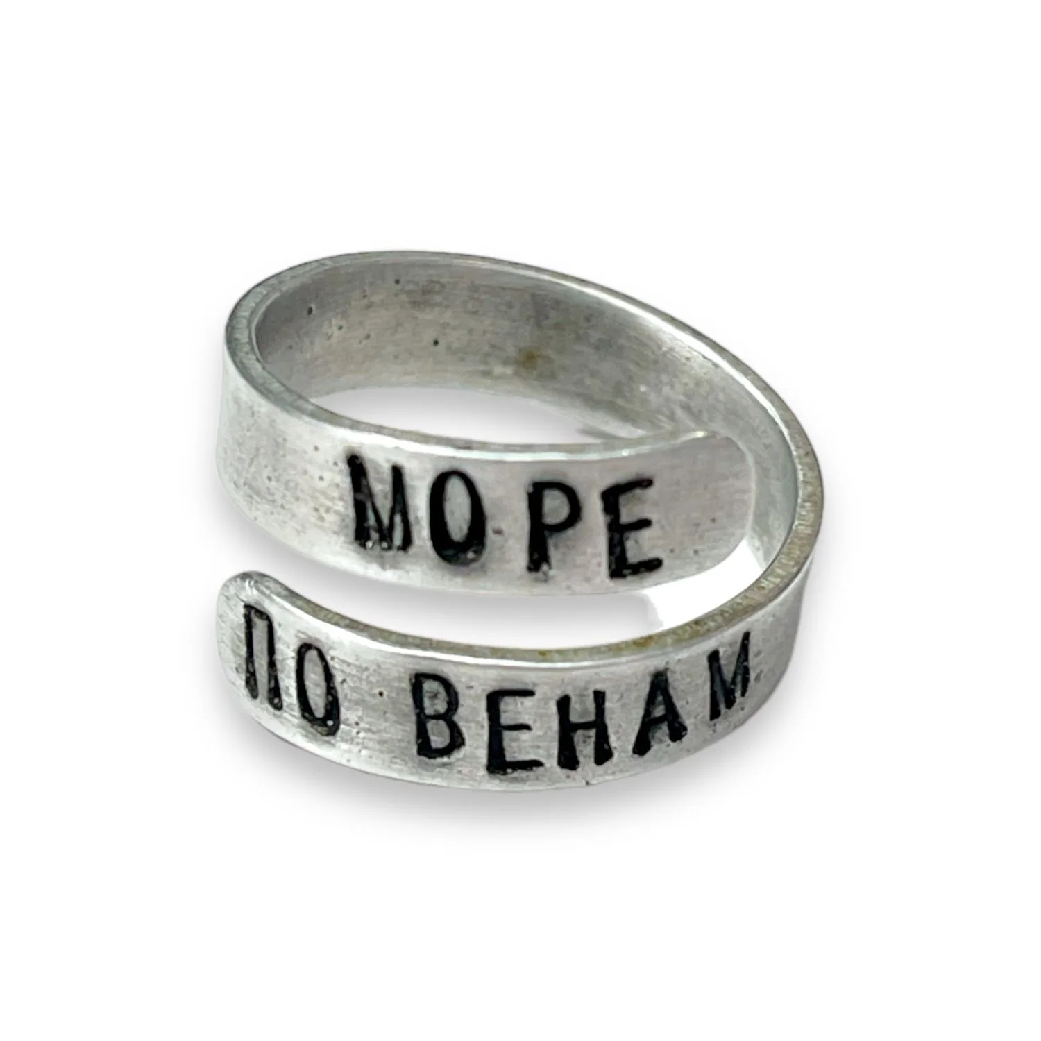 Кольцо изготовлено из алюминия, прошло 4 этапа шлифовки и полировки, после чего методом ручной чеканки на него была нанесена надпись.