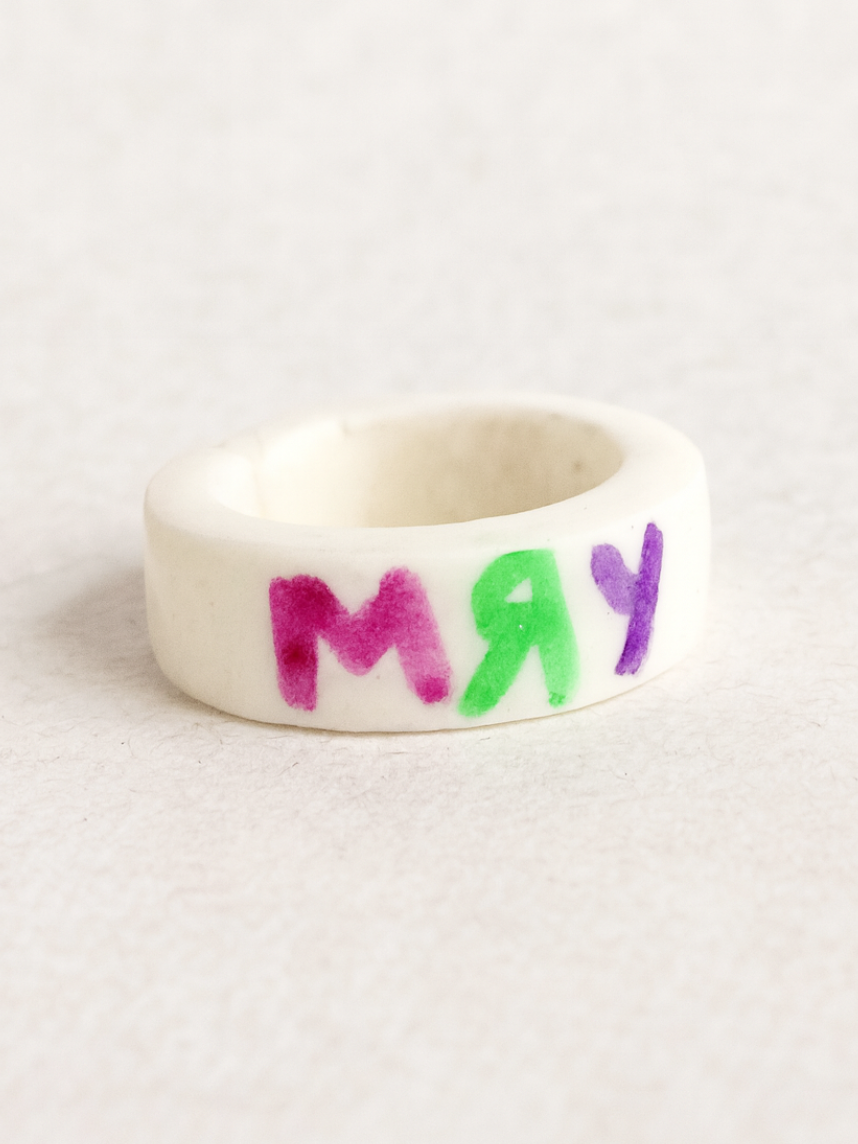 Сделано вручную в петербургской мастерской «Радость рядом» из полимерной глины, надпись выполнена маркером и покрыта лаком.
