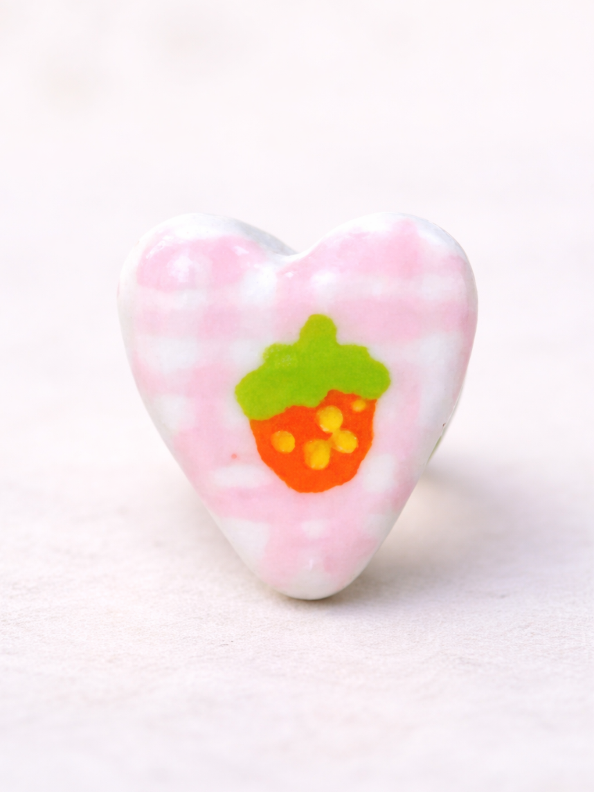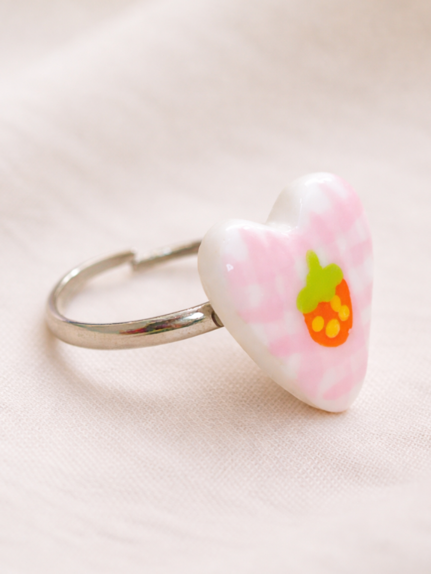 Милое объемное кольцо ручной работы в виде сердца с клубничкой. Необычный подарок для себя или подруги!