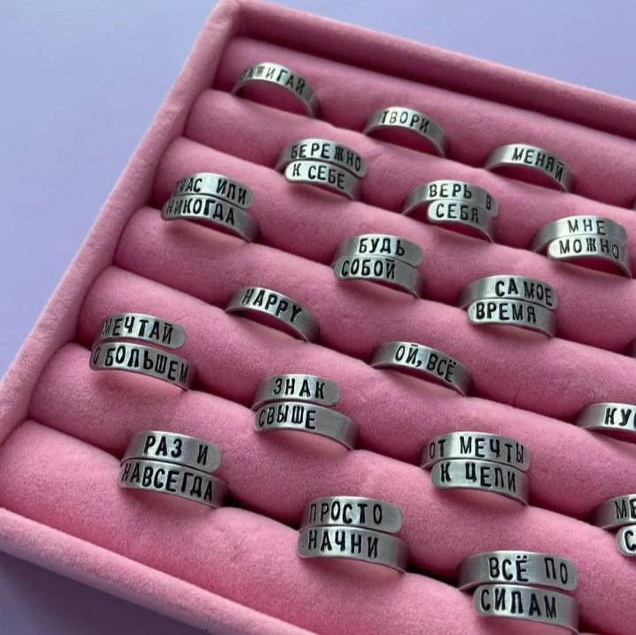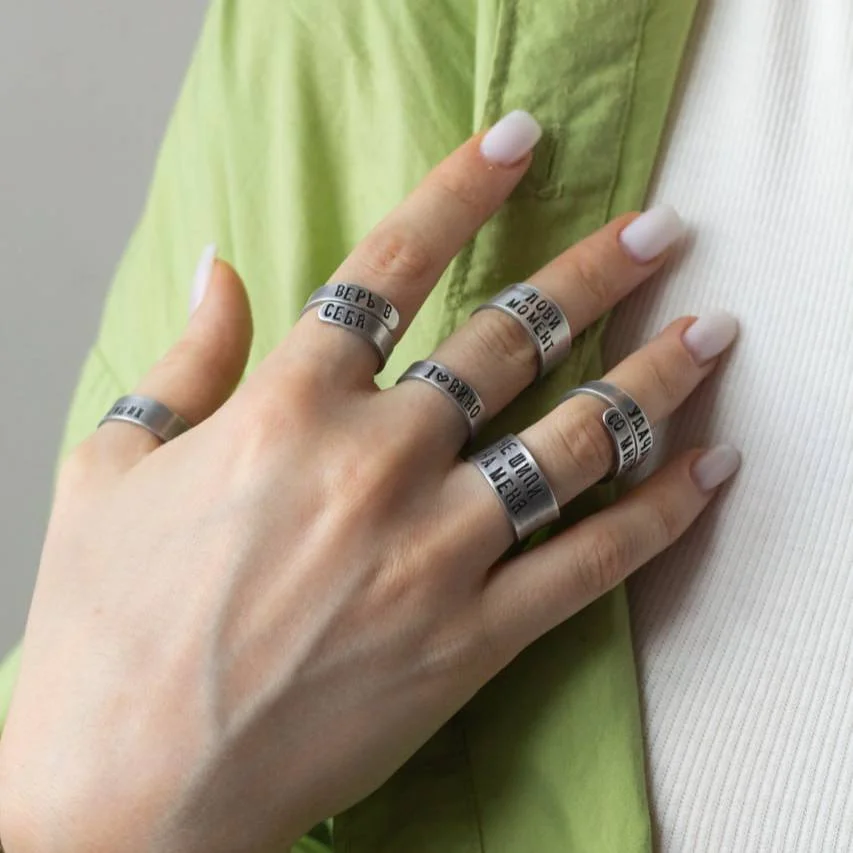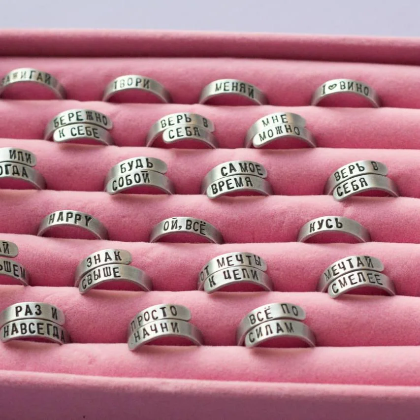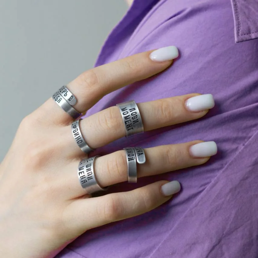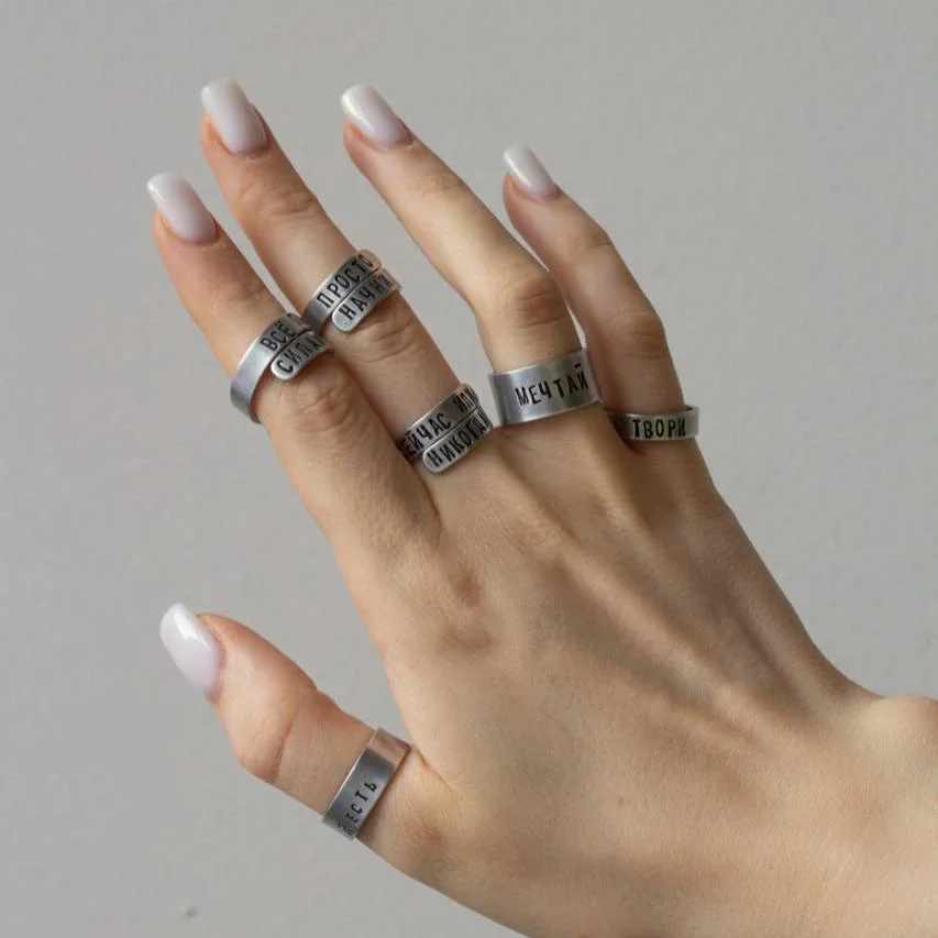 Кольцо изготовлено из алюминия, прошло 4 этапа шлифовки и полировки, после чего методом ручной чеканки на него была нанесена надпись.