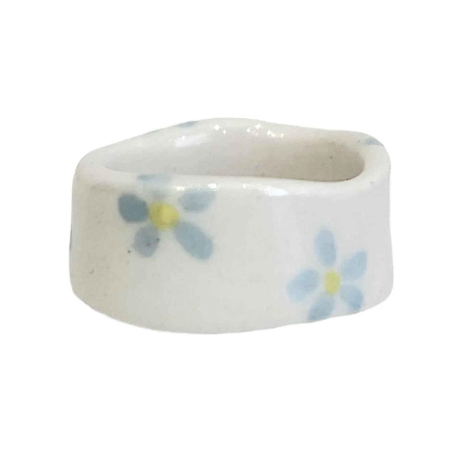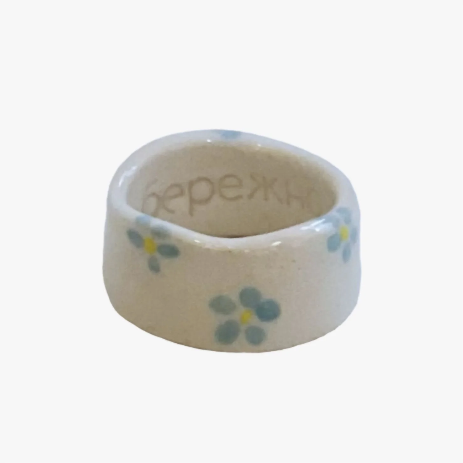 Кольцо ручной работы Бережно «Голубые цветочки»‎‎, керамика, белое