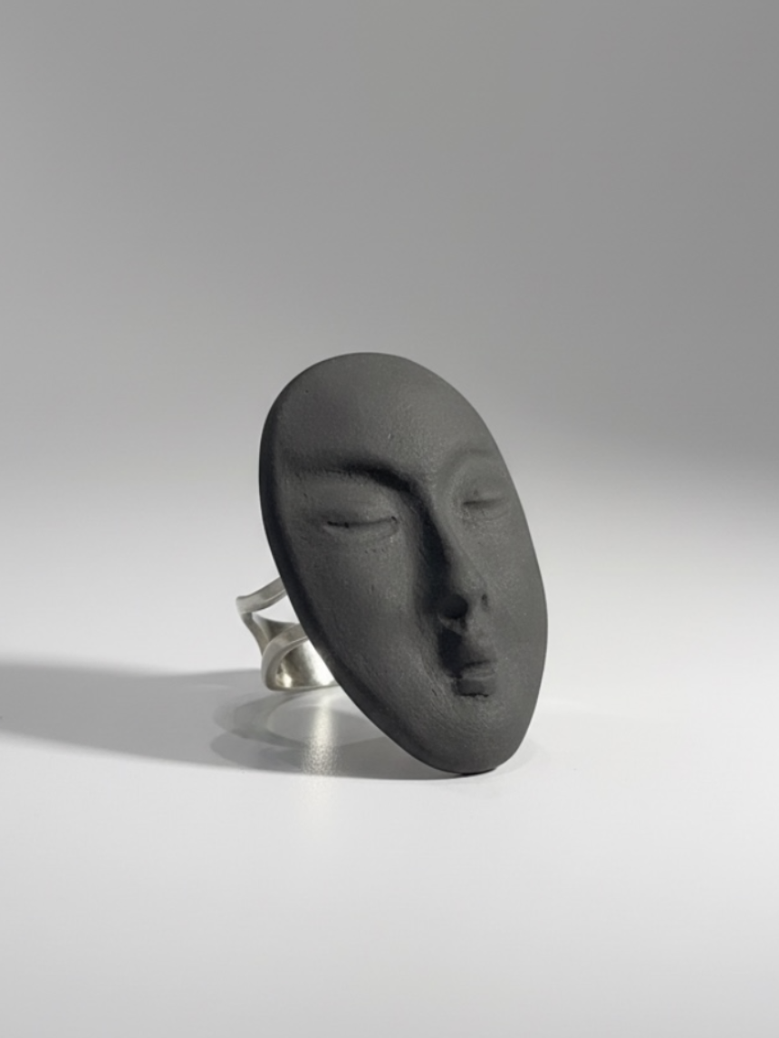 Кольцо ручной работы «Лицо овальное», черное, фарфор