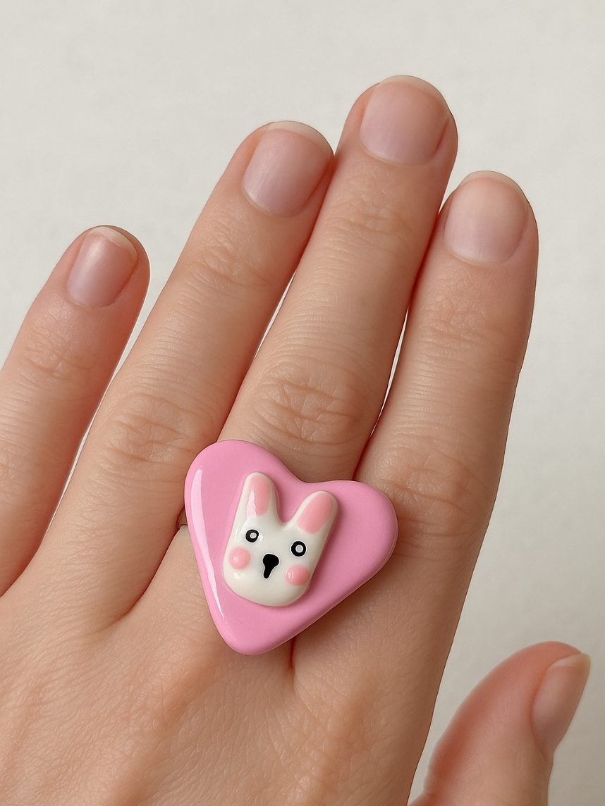 Кольцо ручной работы незамкнутое Сердце с зайкой, полимерная глина