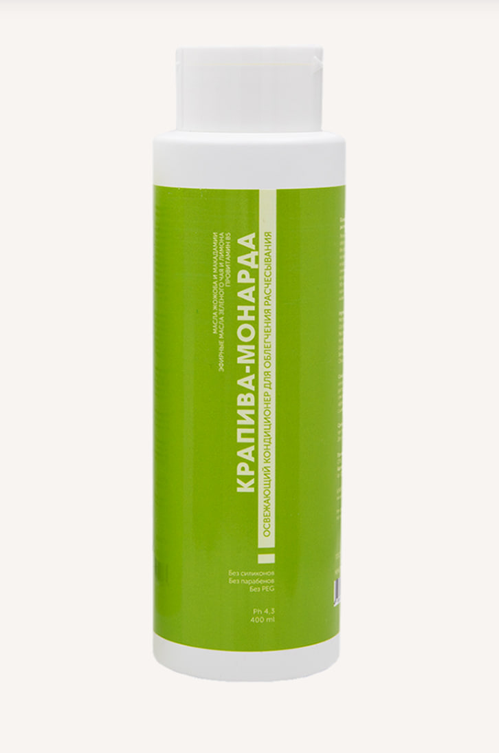 Легкий скользящий бальзам-кондиционер для облегчения расчесывания «Крапива-мондарда» без силиконов обеспечивает волосам мягкость и блеск без утяжеления.