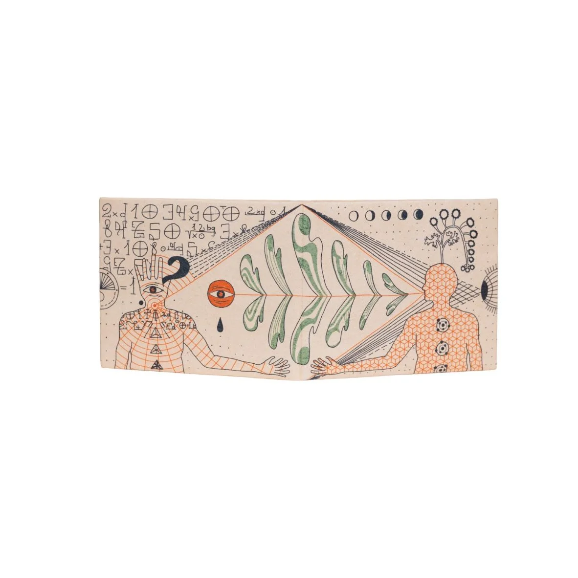 Кошелёк «New Mystic» - это уникальный аксессуар, который сочетает в себе науку и загадочность. Его дизайн вдохновлен странными словами и псевдонаучным подтекстом. Божественное Солнце наблюдает за этими загадочными персонами, пытающимися общаться, но испытывающими трудности перевода. Может быть, оно сможет разгадать этот мир странных слов? Толщина - 5 мм. Вес - 15 грамм. Вмещает 20 купюр и 10 карт. Материал не пропускает влагу и сохраняет ваши вещи в случае попадания жидкости.