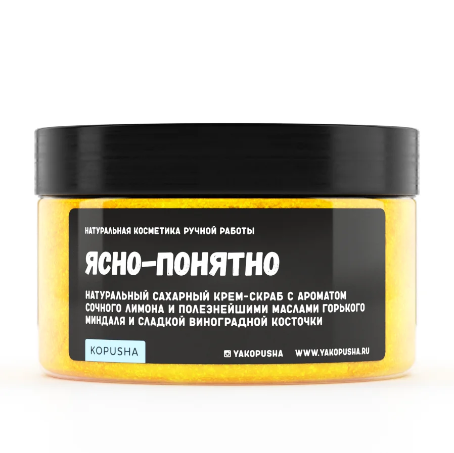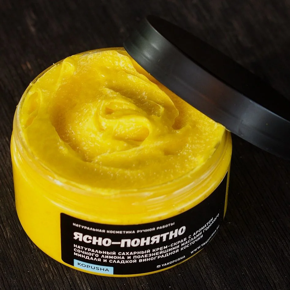 Крем-скраб "Ясно-понятно" от бренда KOPUSHA - это идеальное сочетание лимонного аромата, масла миндаля и виноградной косточки.