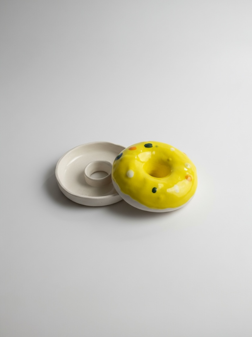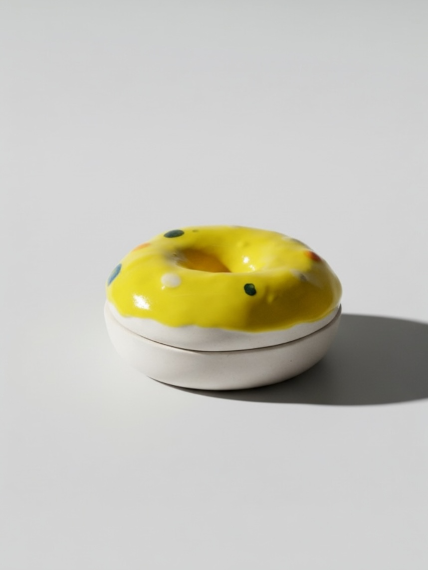 Круглая шкатулка ручной работы в виде пончика, жёлтая, керамика, 9 см