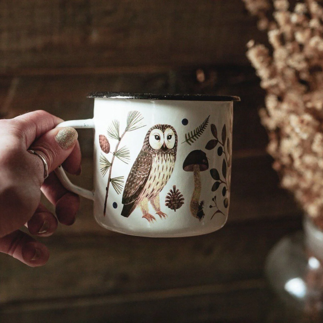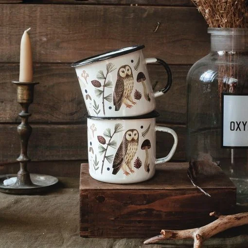 Эмалированная кружка с лесным пейзажем и изображением совы и листьев черники. Технология печати — настоящая деколь, как на советских походных кружках. Рисунок был создан вручную в небольшой мастерской с использованием техники шёлкографии.