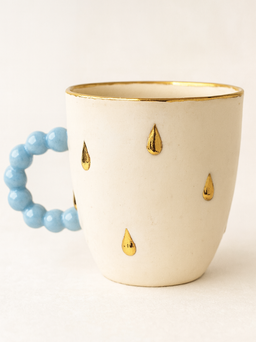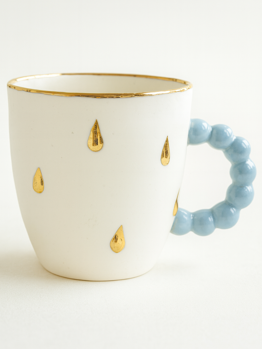 Кружка ручной работы из фарфора, белая с золотыми каплями и голубой ручкой, объём 300 мл