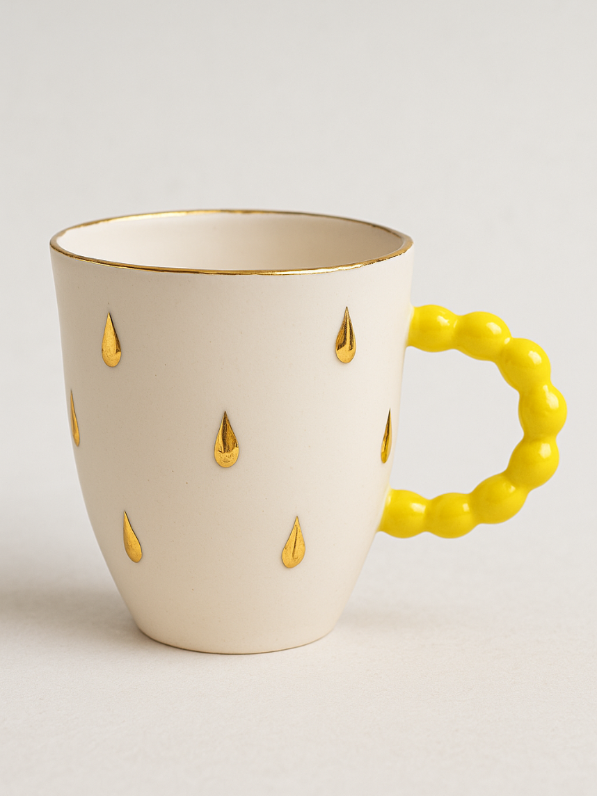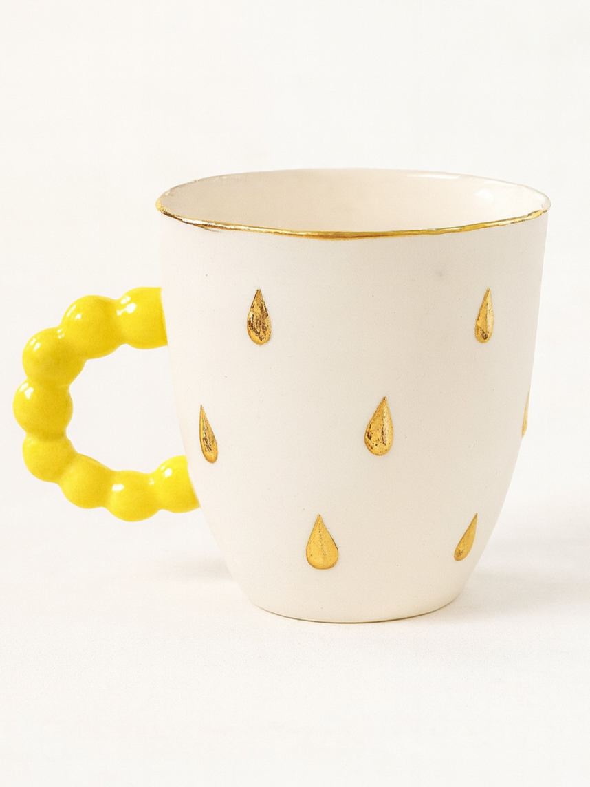 Кружка ручной работы из фарфора, белая с золотыми каплями и жёлтой ручкой, объём 300 мл