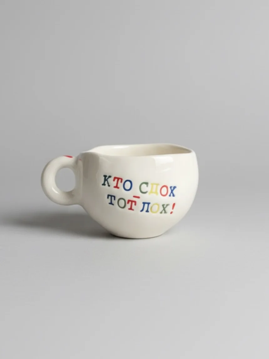 Керамическая кружка ручной работы с надписью «Кто сдох - тот лох». Производитель - петербургская керамистка Аня Мурмыло (Keramurrr).