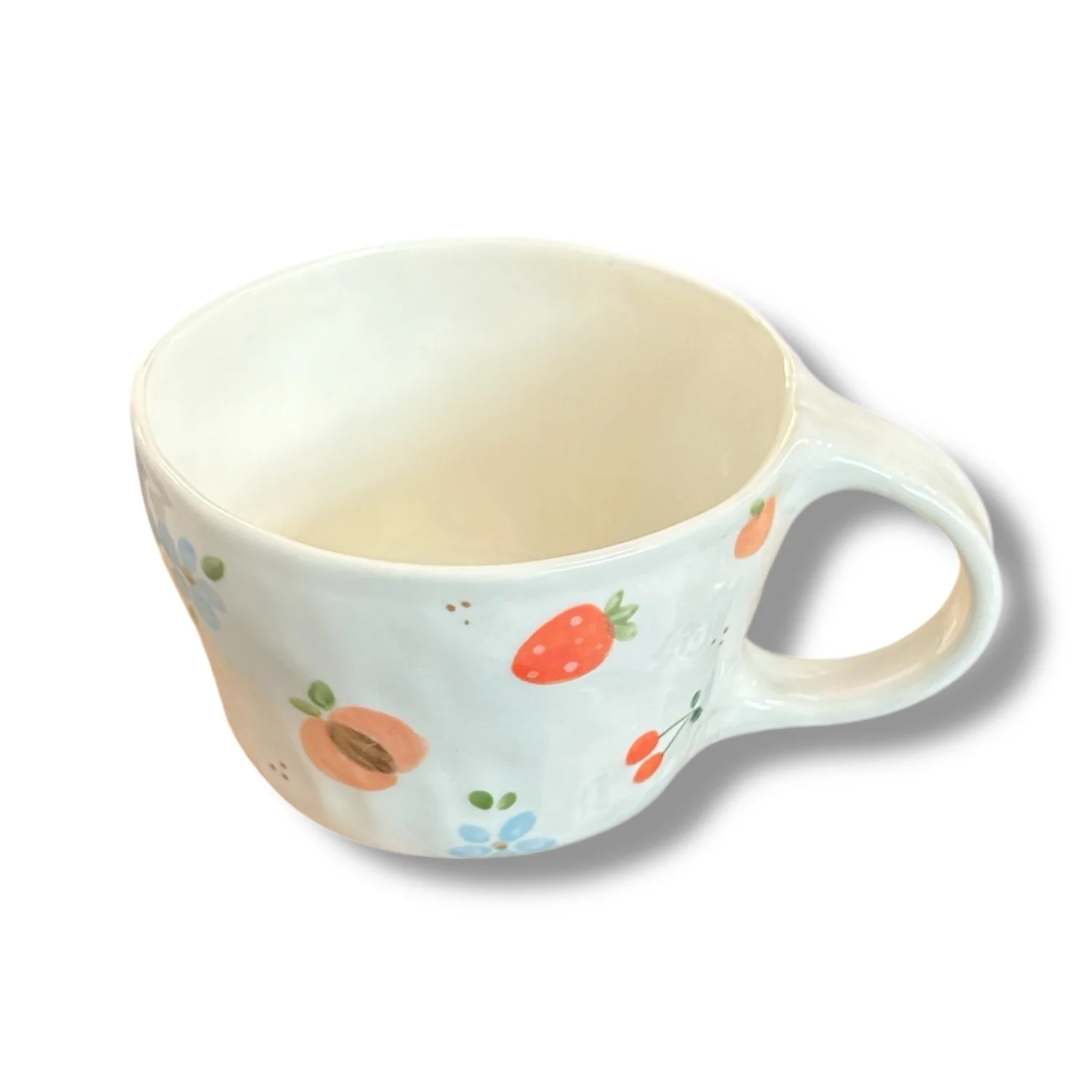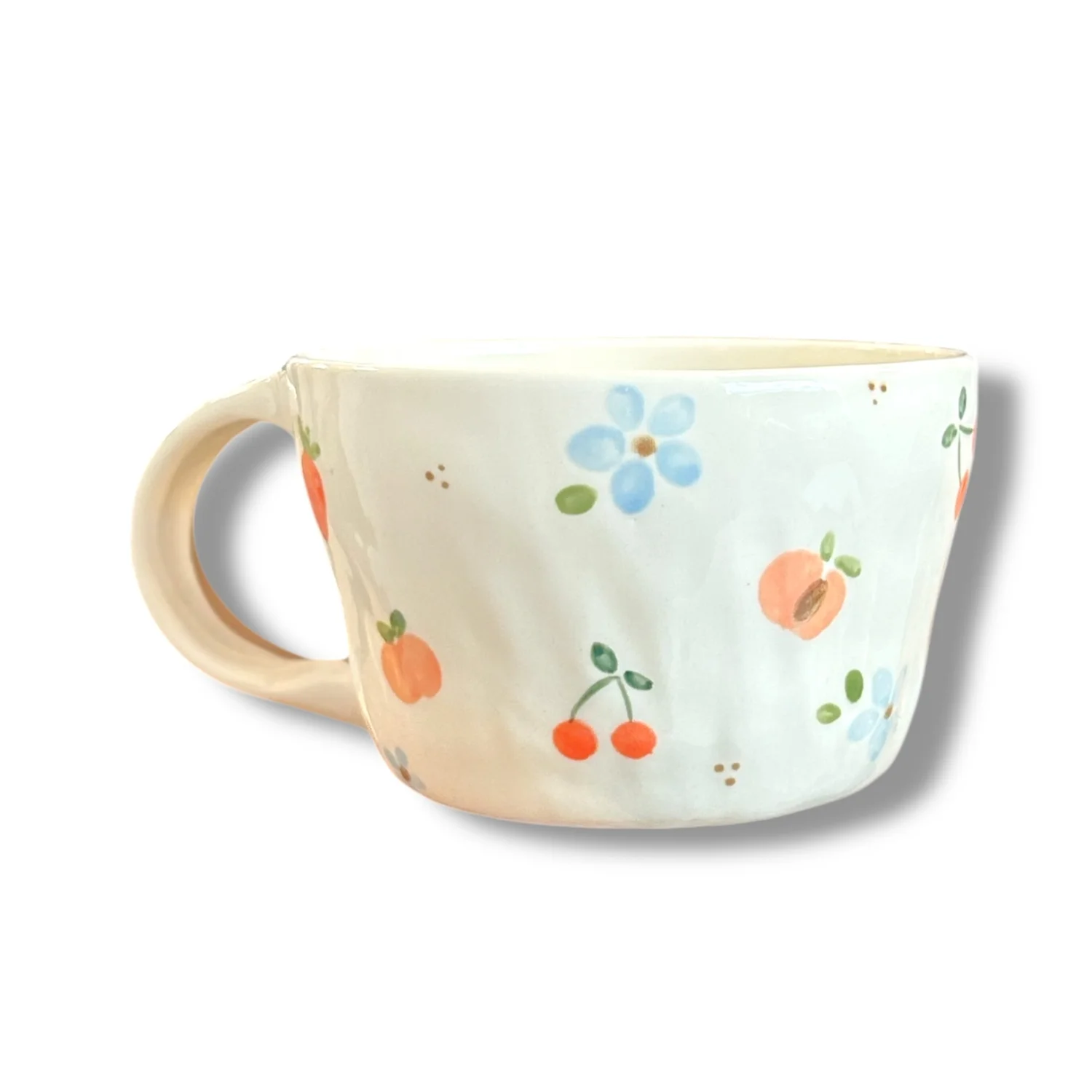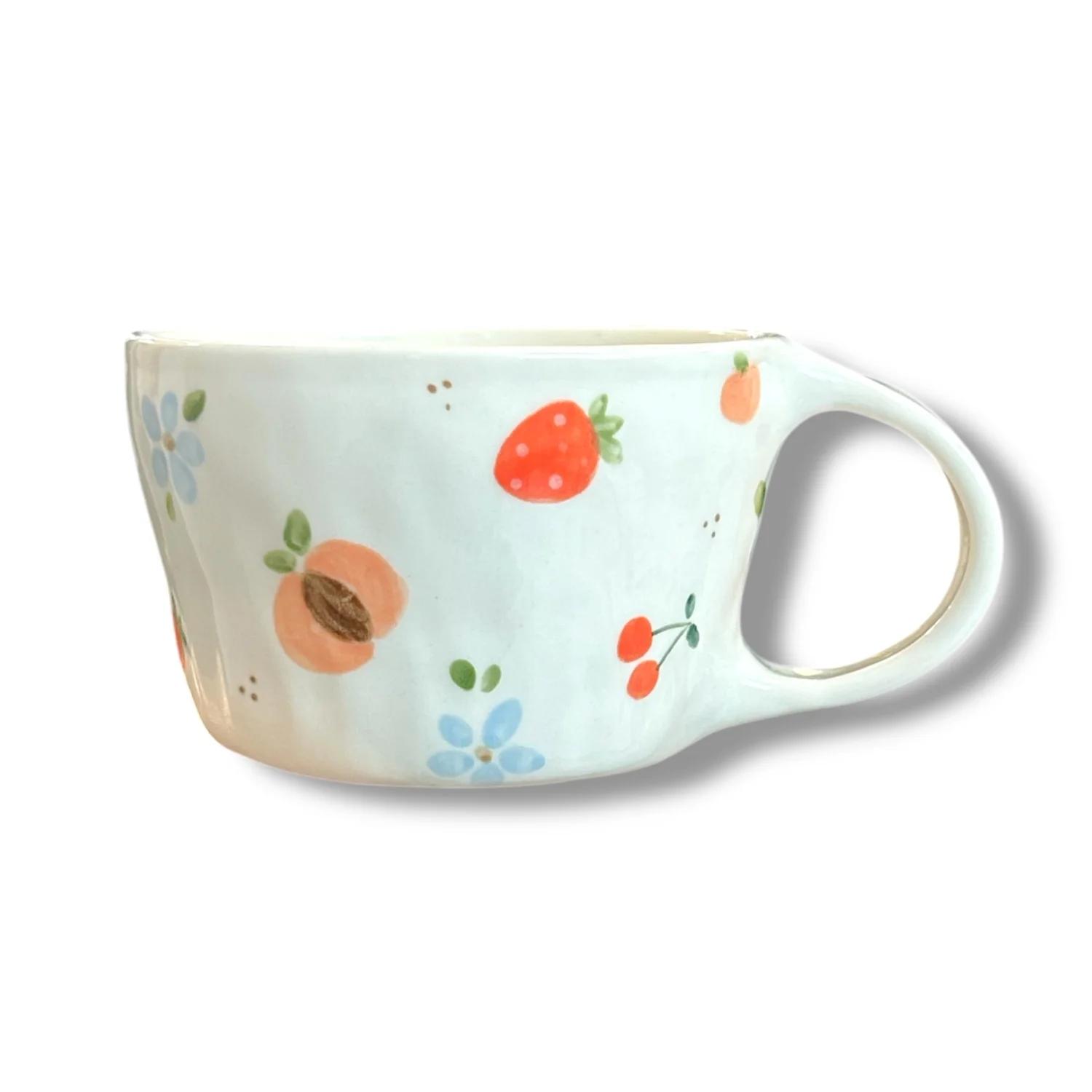 Кружка ручной работы «Клубника, персики и цветы» — изящный и уютный аксессуар, выполненный из качественной керамики с объемом 300 мл.