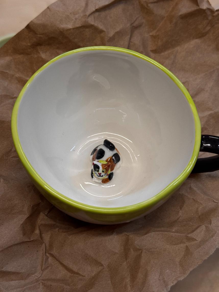 Кружка ручной работы круглая с фигуркой внутри «Котик», зеленая, 300 мл