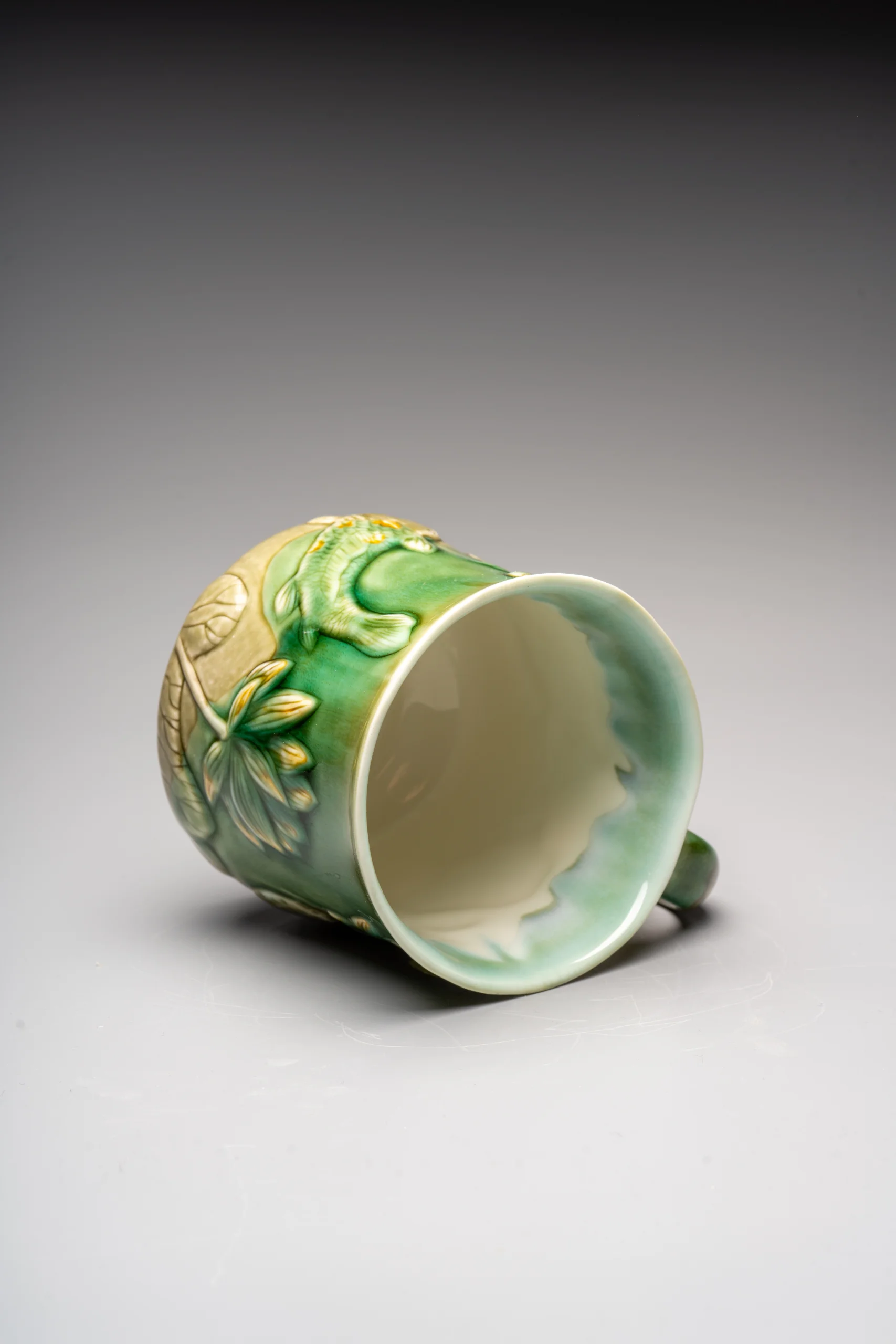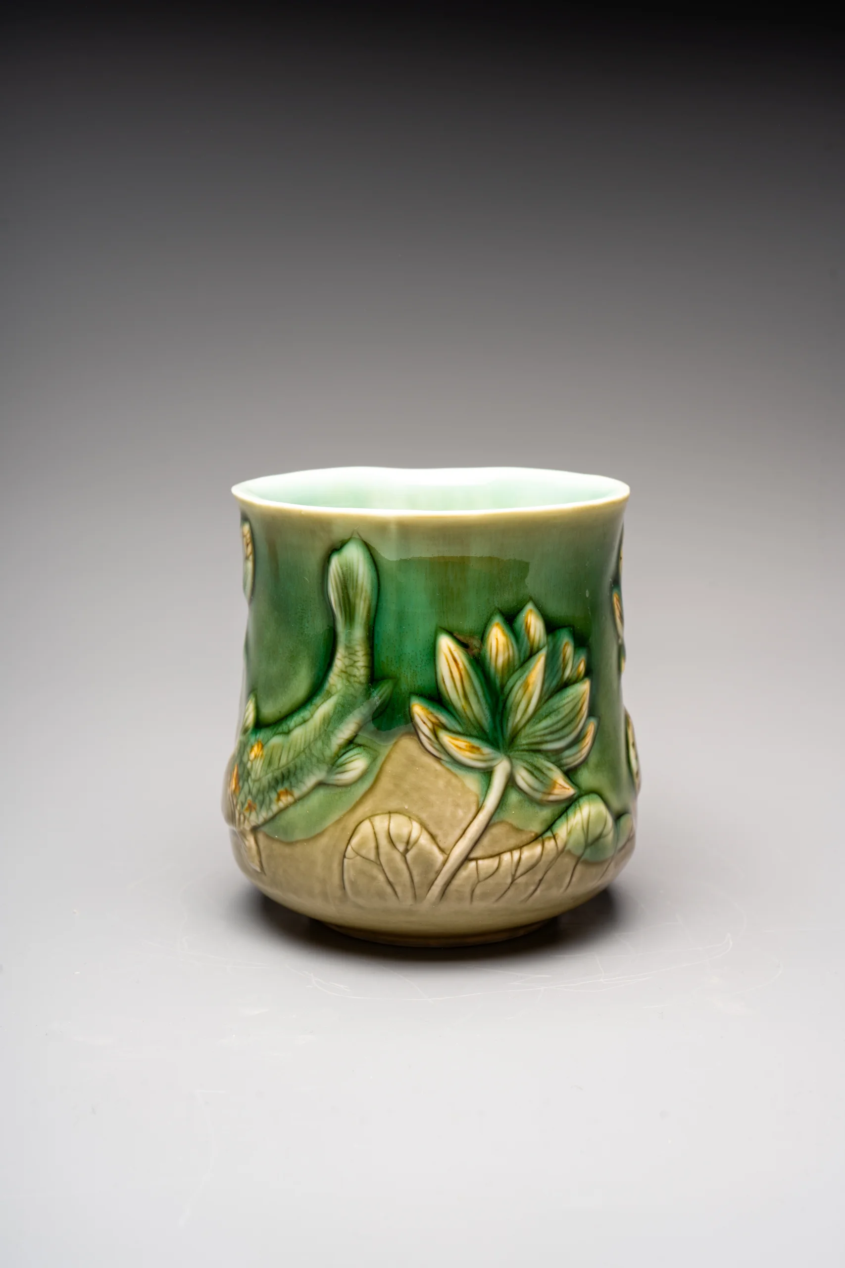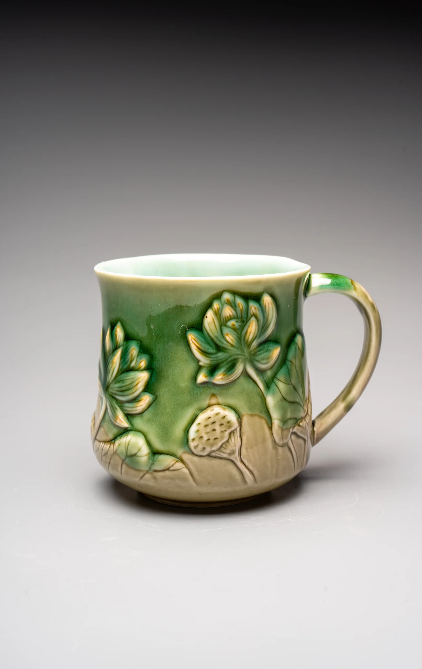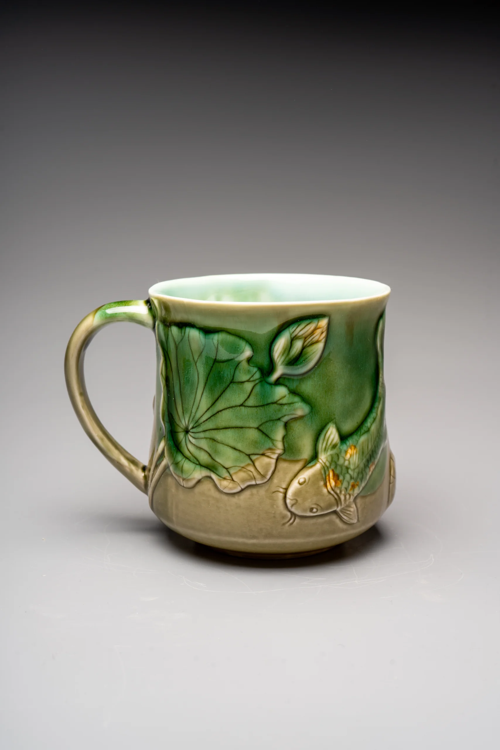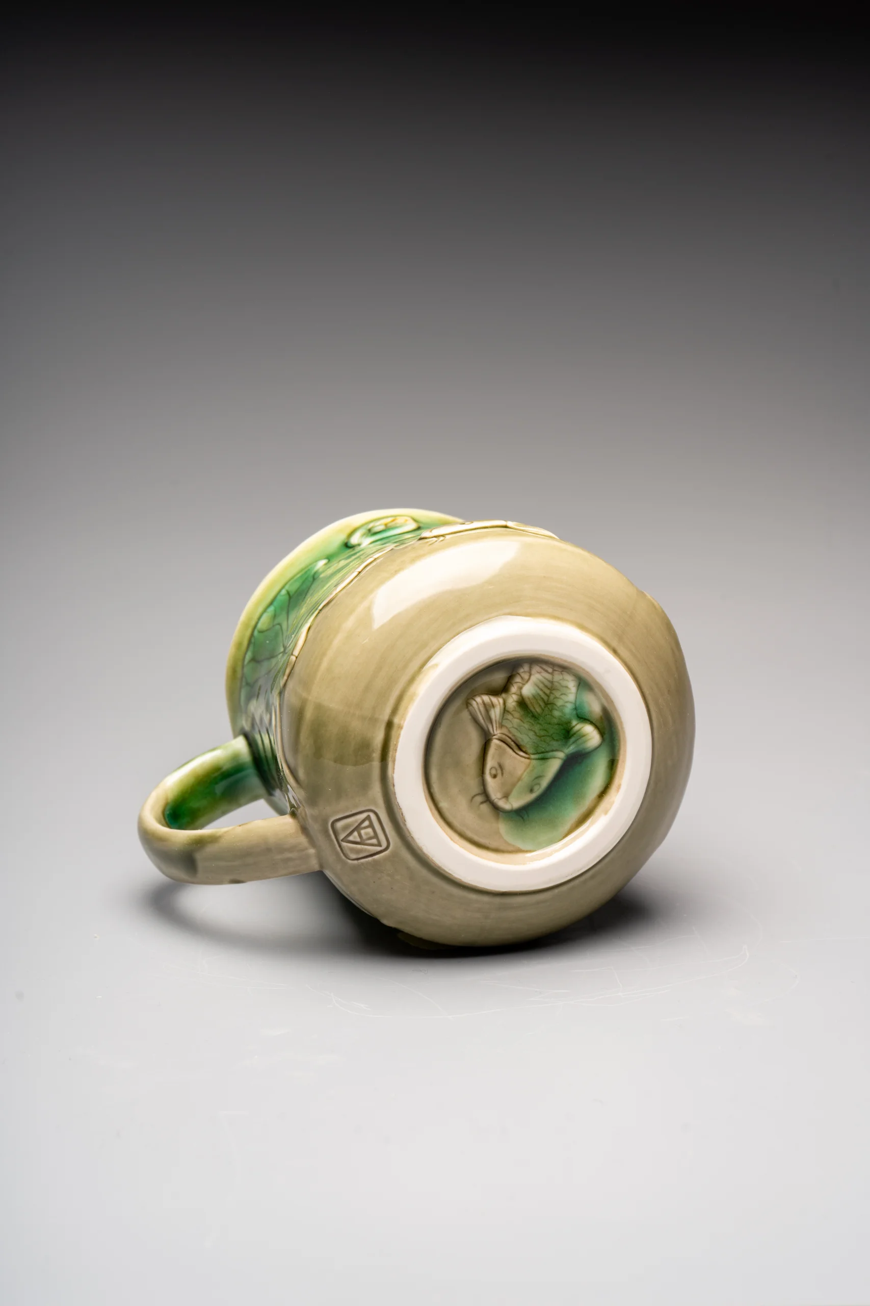 Кружка ручной работы Керамика Александры Пылиной «Лотос и карп», оливковая, фарфор, 430 мл