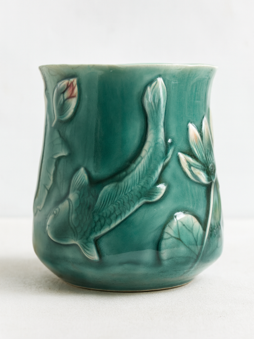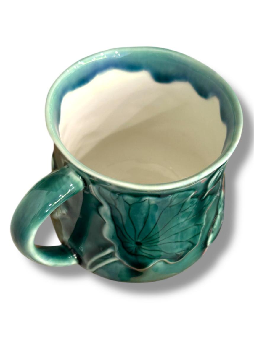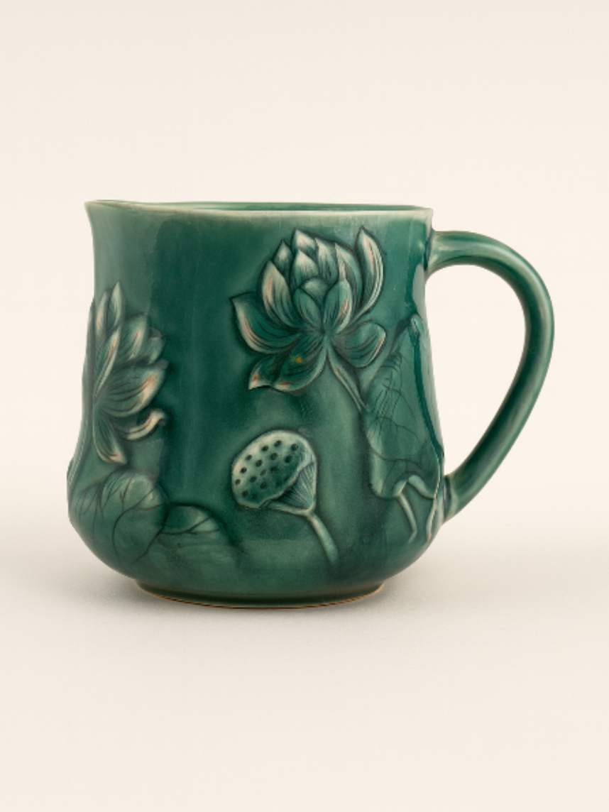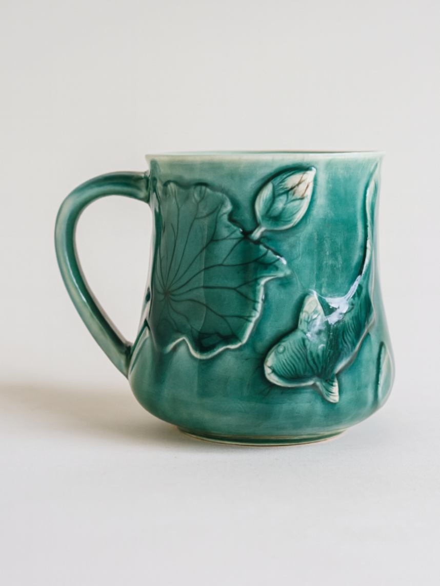 Кружка ручной работы «Лотос и карп», тёмно-зелёная, фарфор, 430 мл