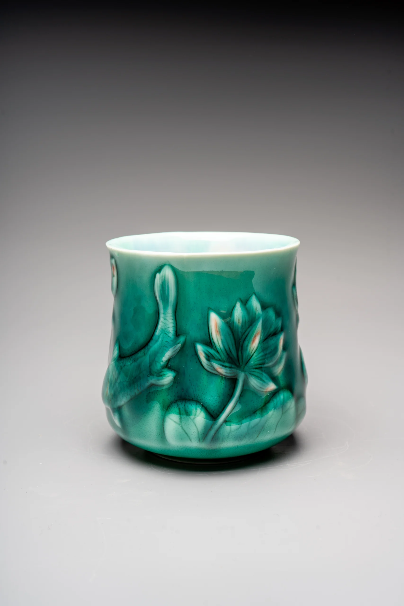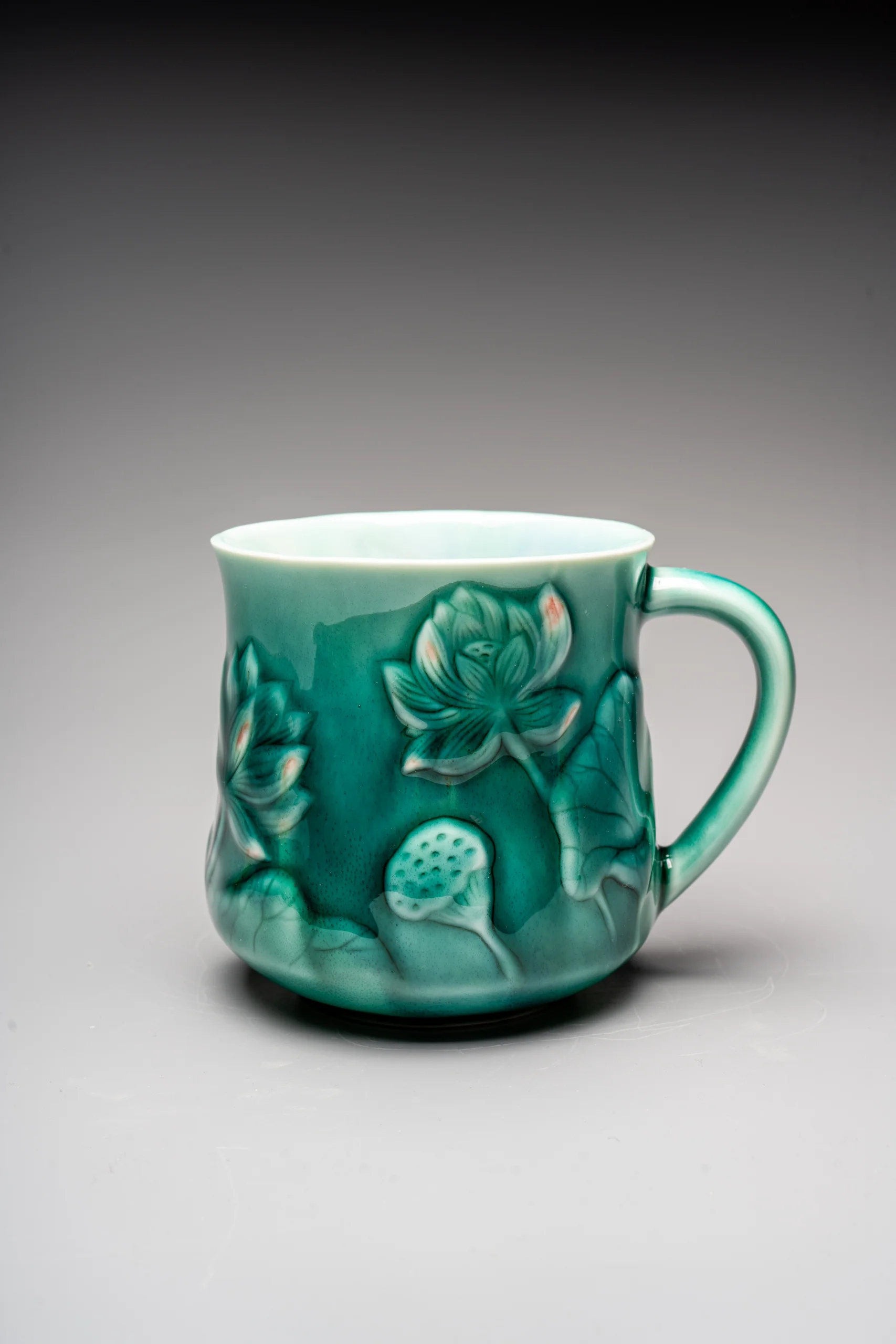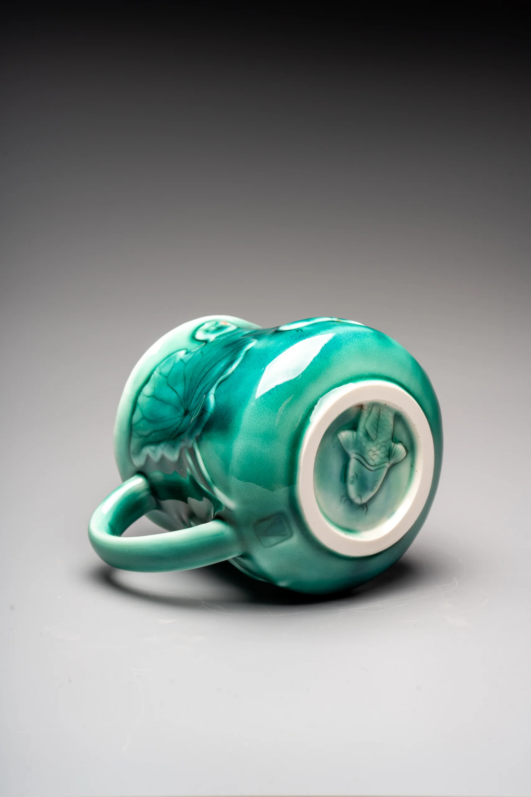 Кружка ручной работы Керамика Александры Пылиной «Лотос и карп», тёмно-зелёная, фарфор, 430 мл