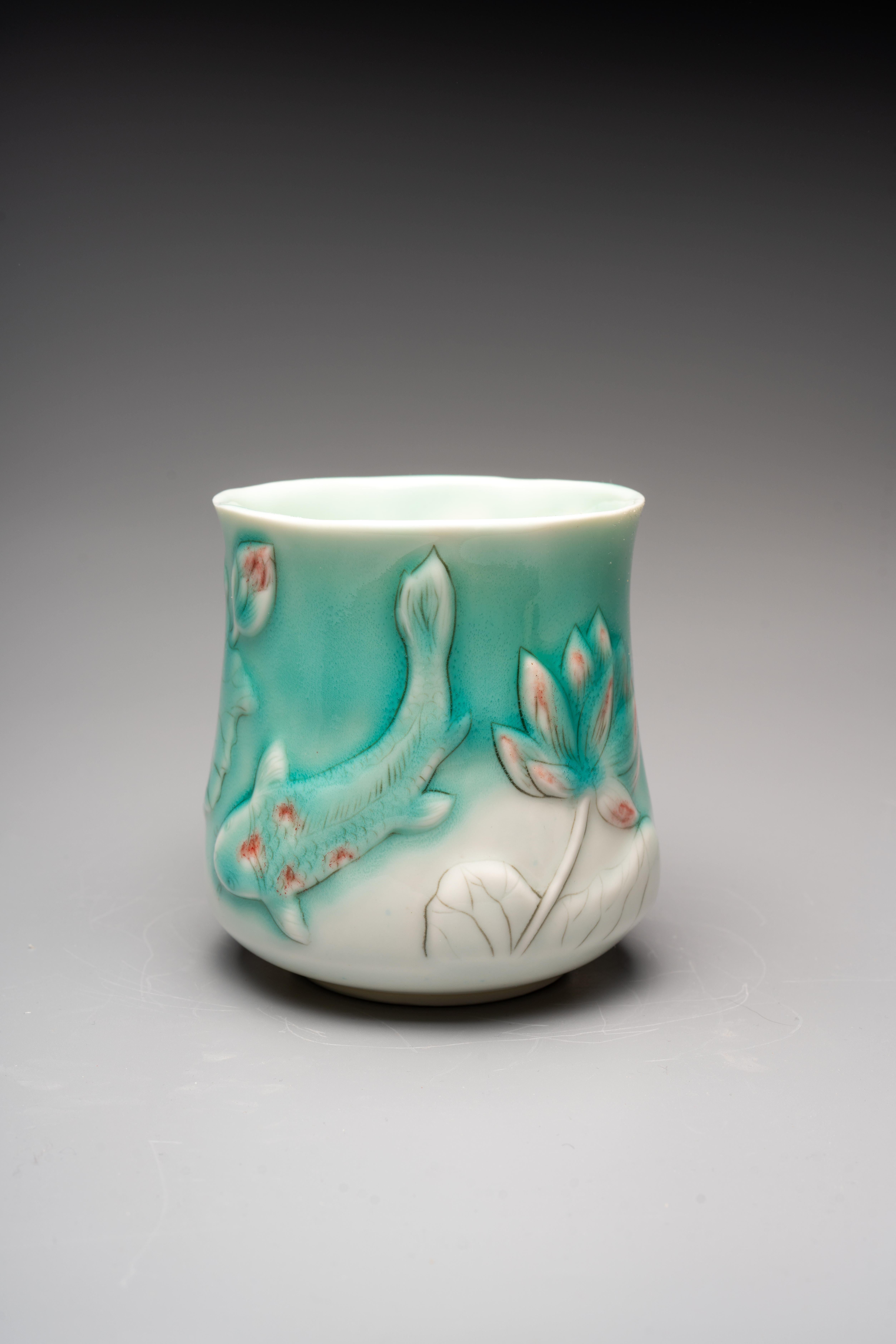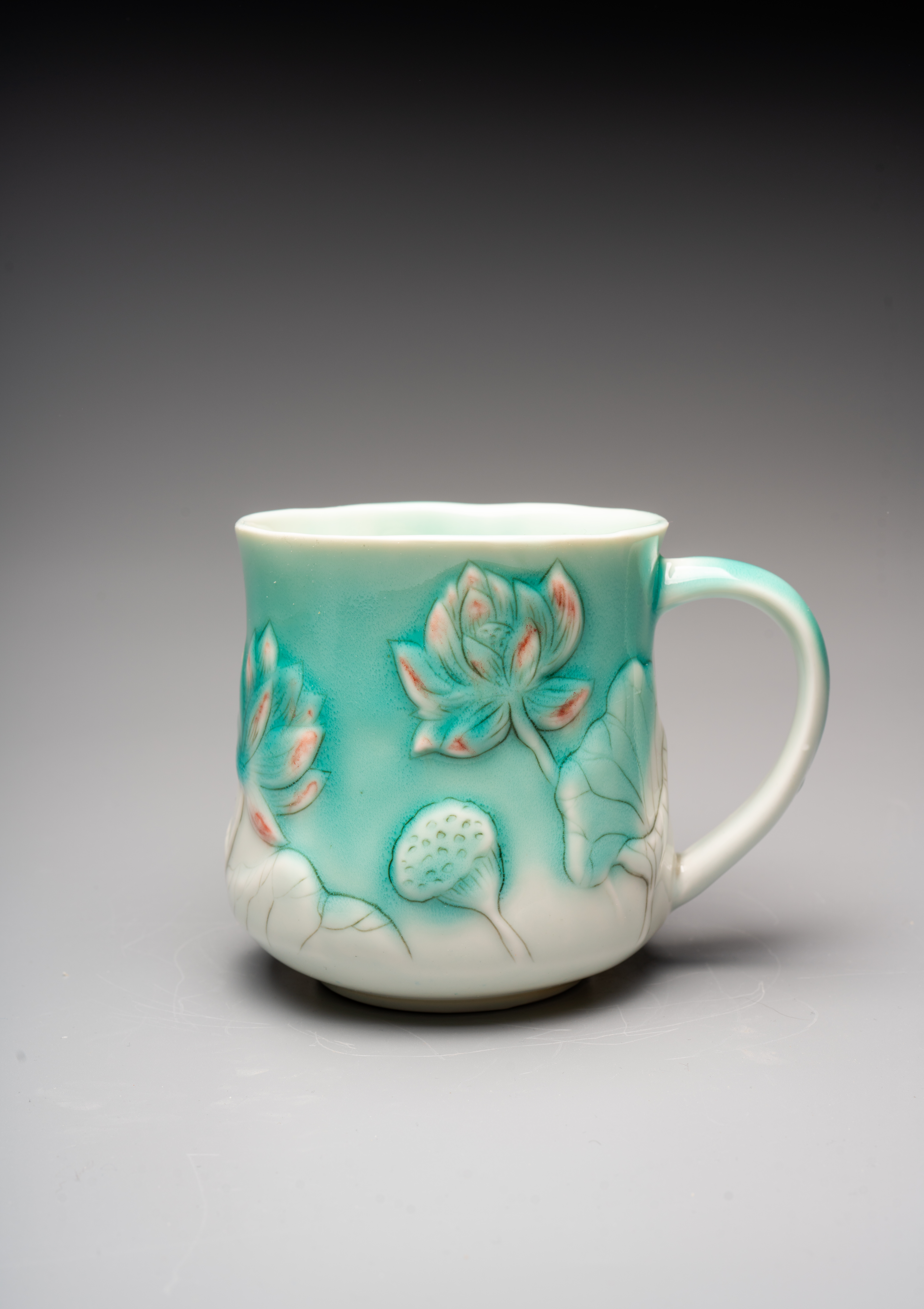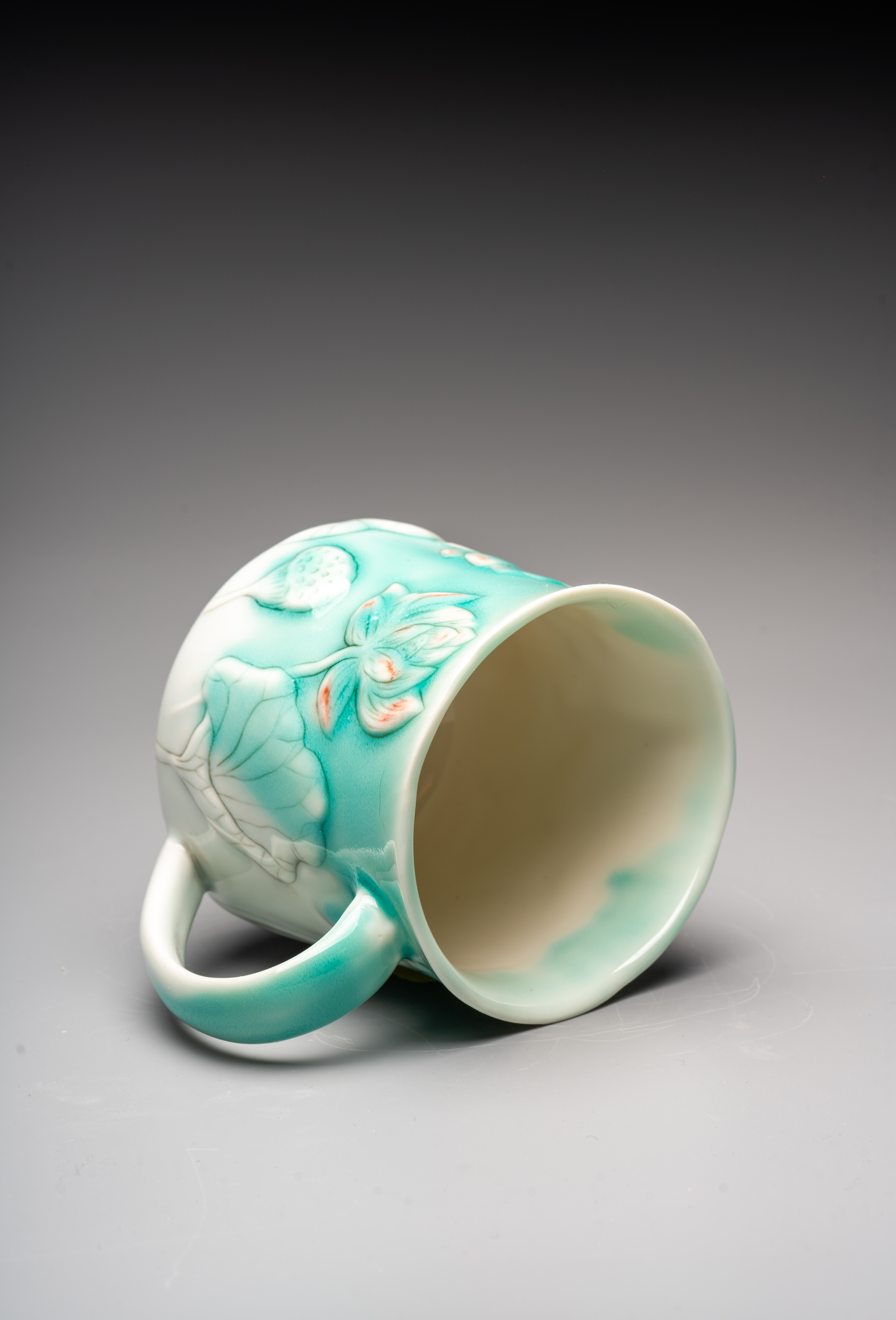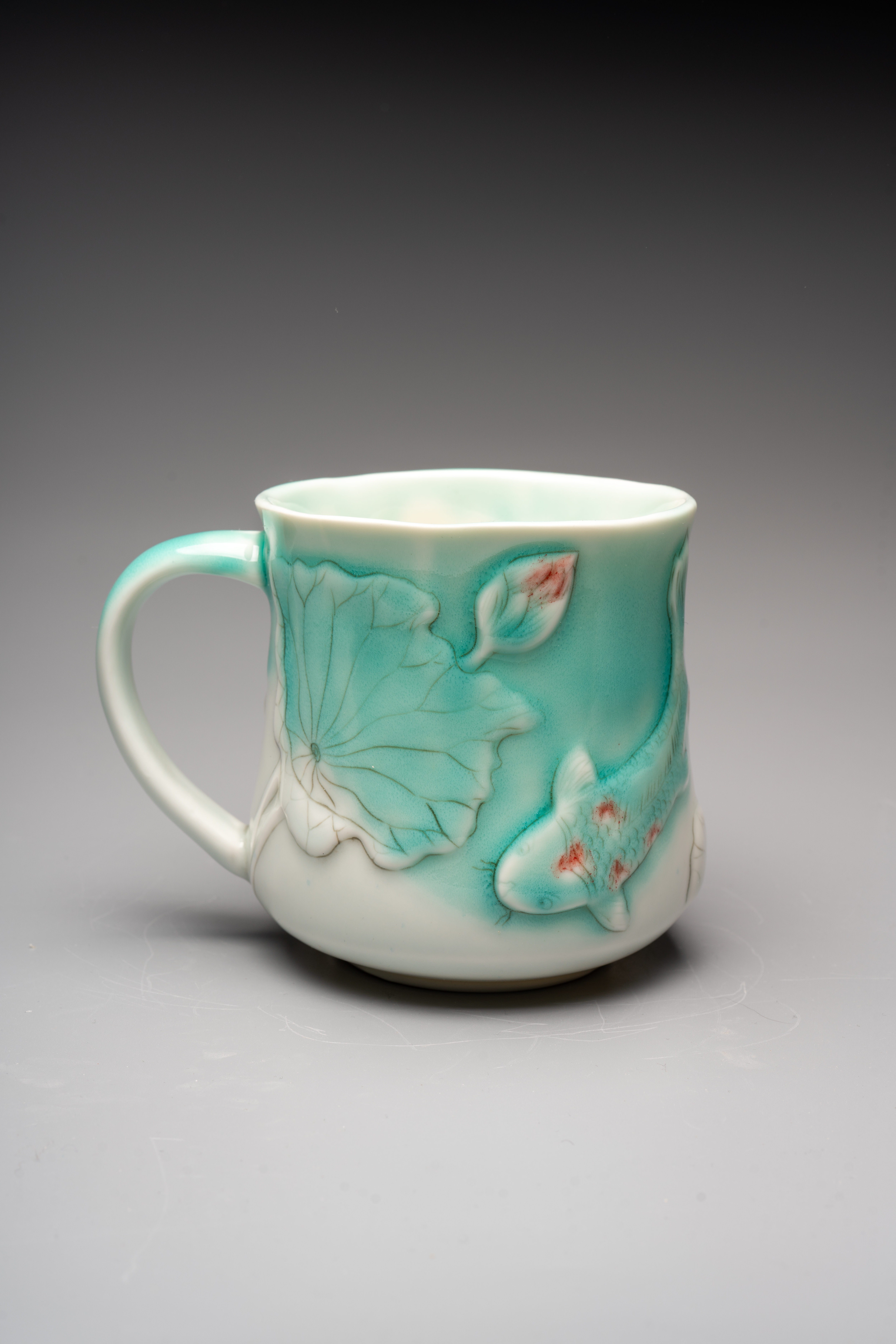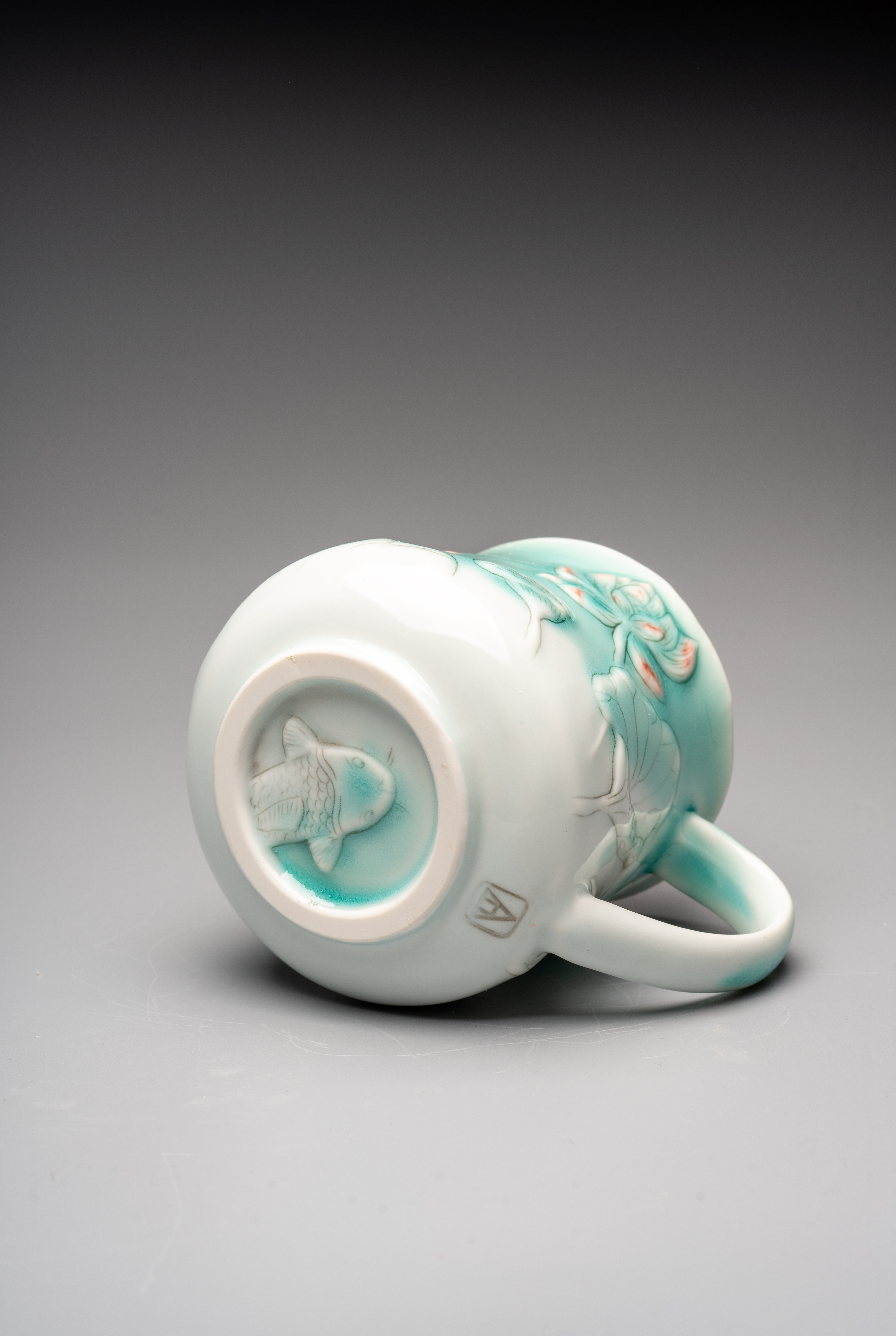 Кружка ручной работы «Лотос и карп», бирюзовая, фарфор, 430 мл