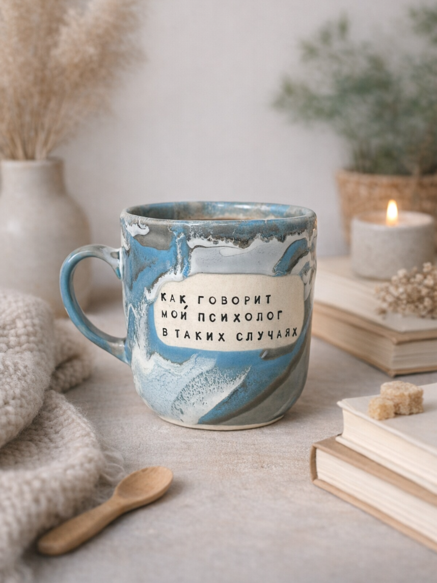 Кружка ручной работы NF ceramics «Как говорит мой психолог..», серо-голубая, 450 мл