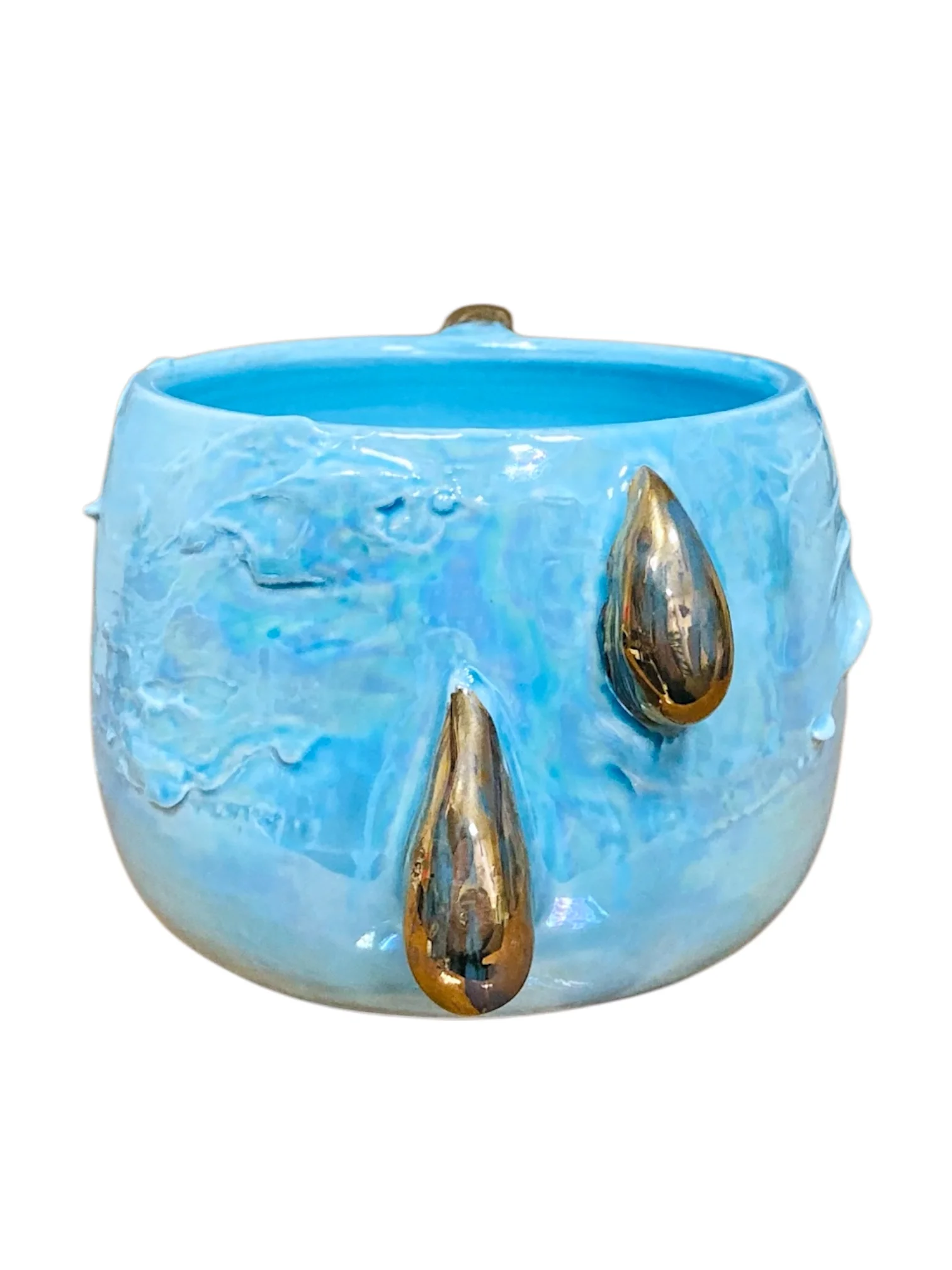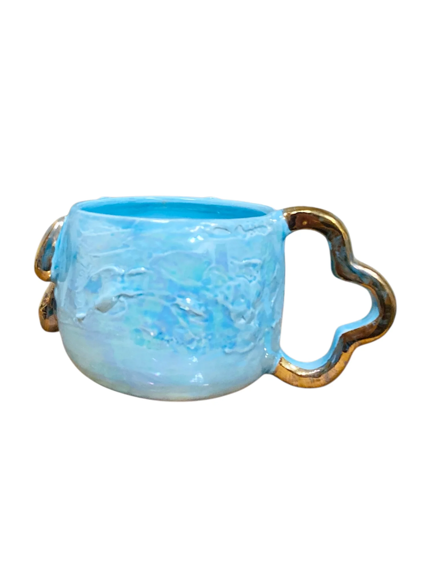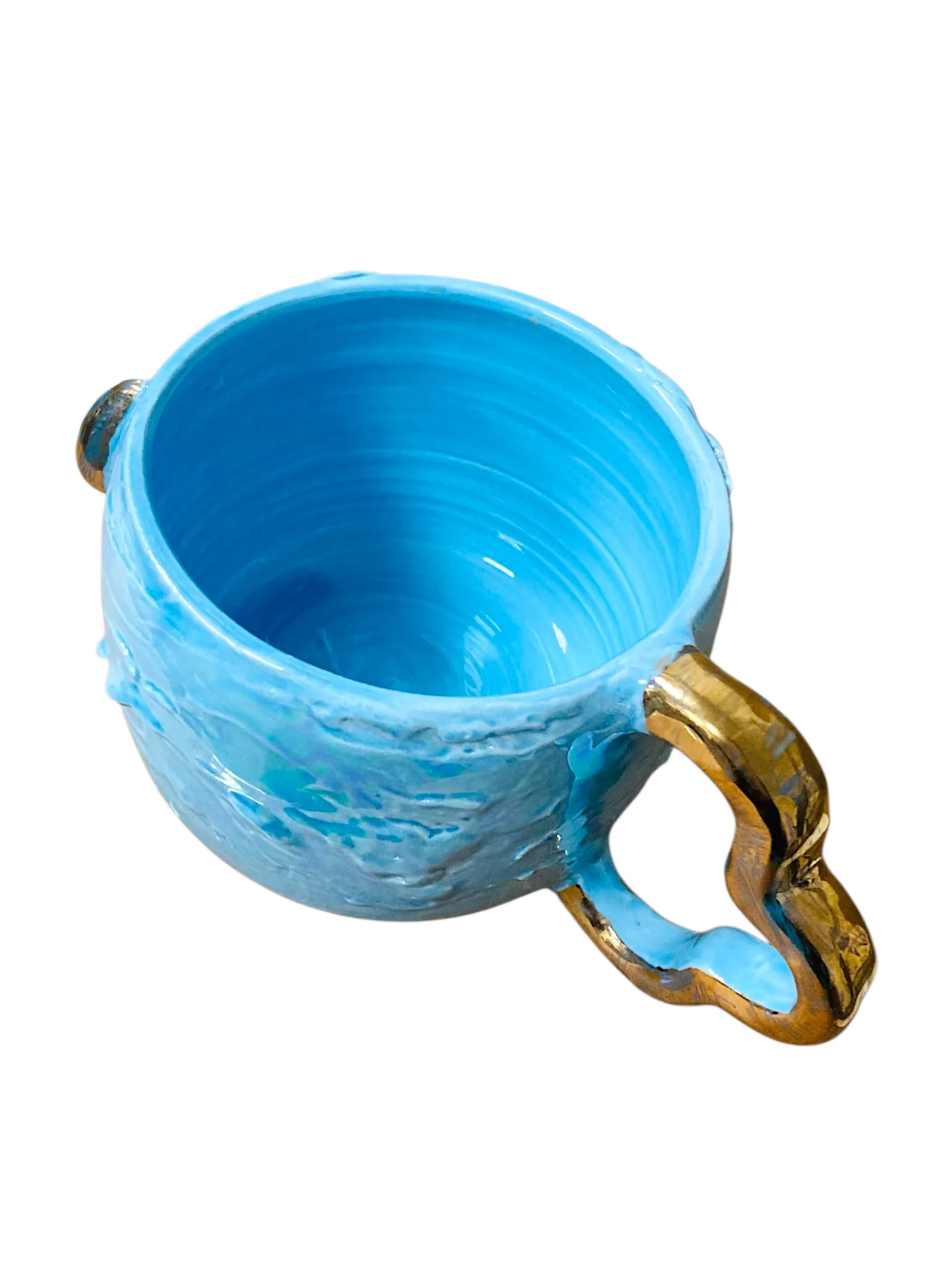 Рельефная кружка с крупными золотистыми каплями, покрыта перламутром.