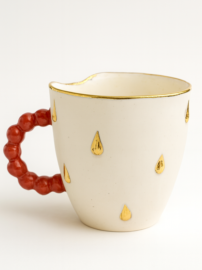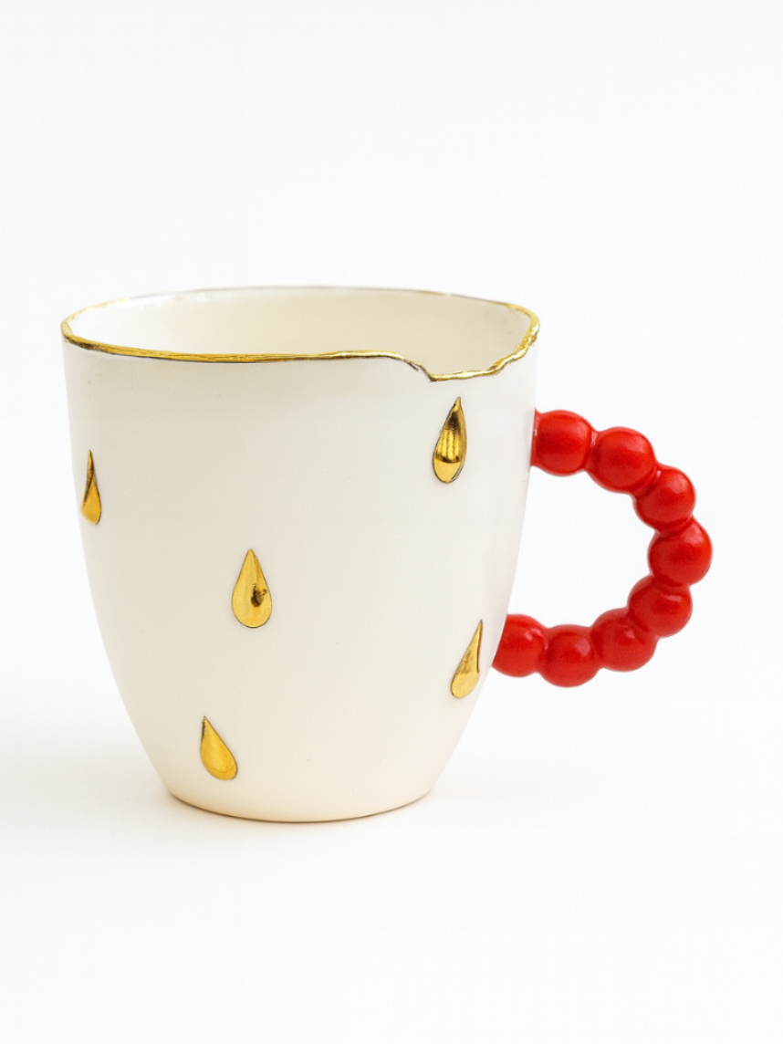Кружка ручной работы «Погрызанная» из фарфора, белая с золотыми каплями и красной ручкой, объём 300 мл