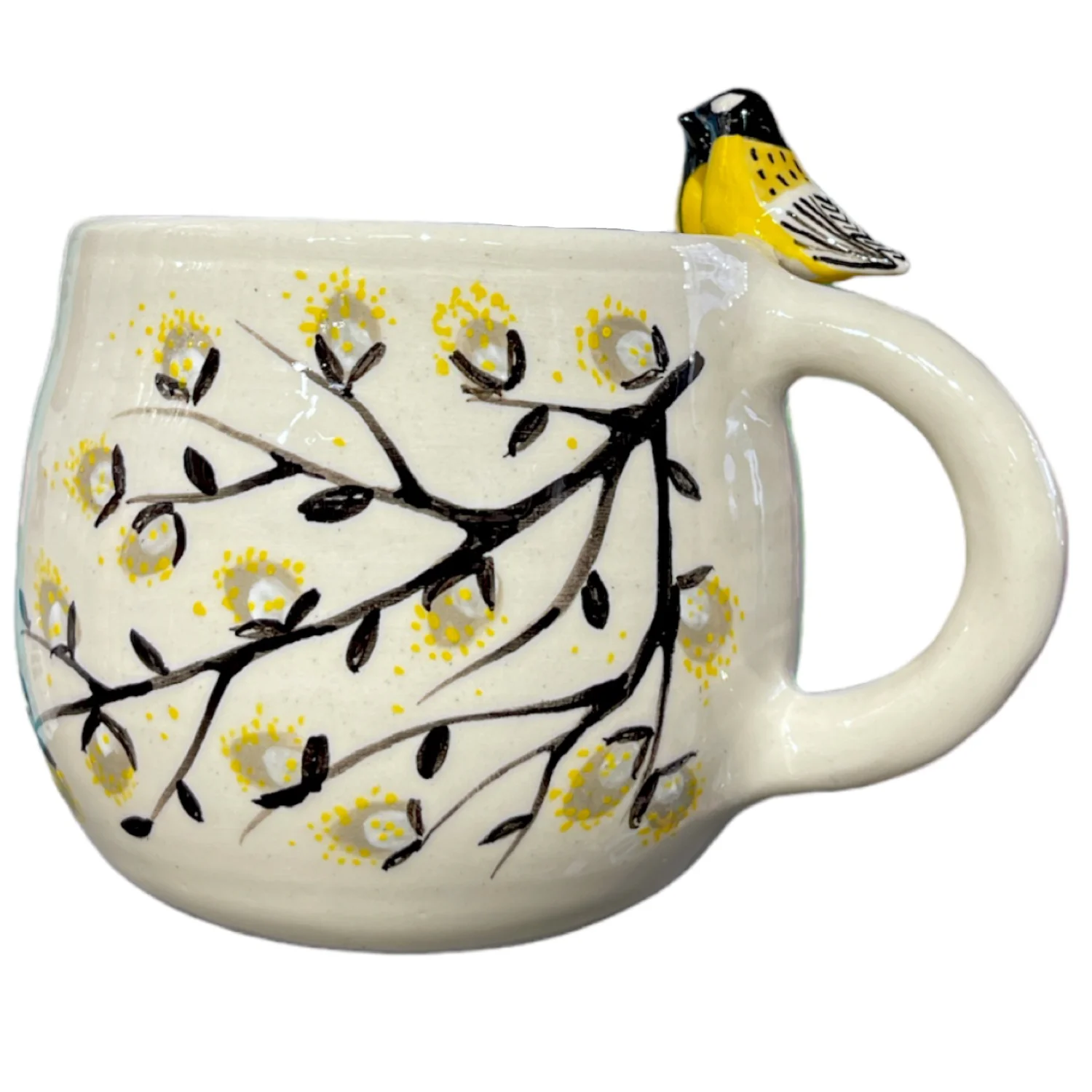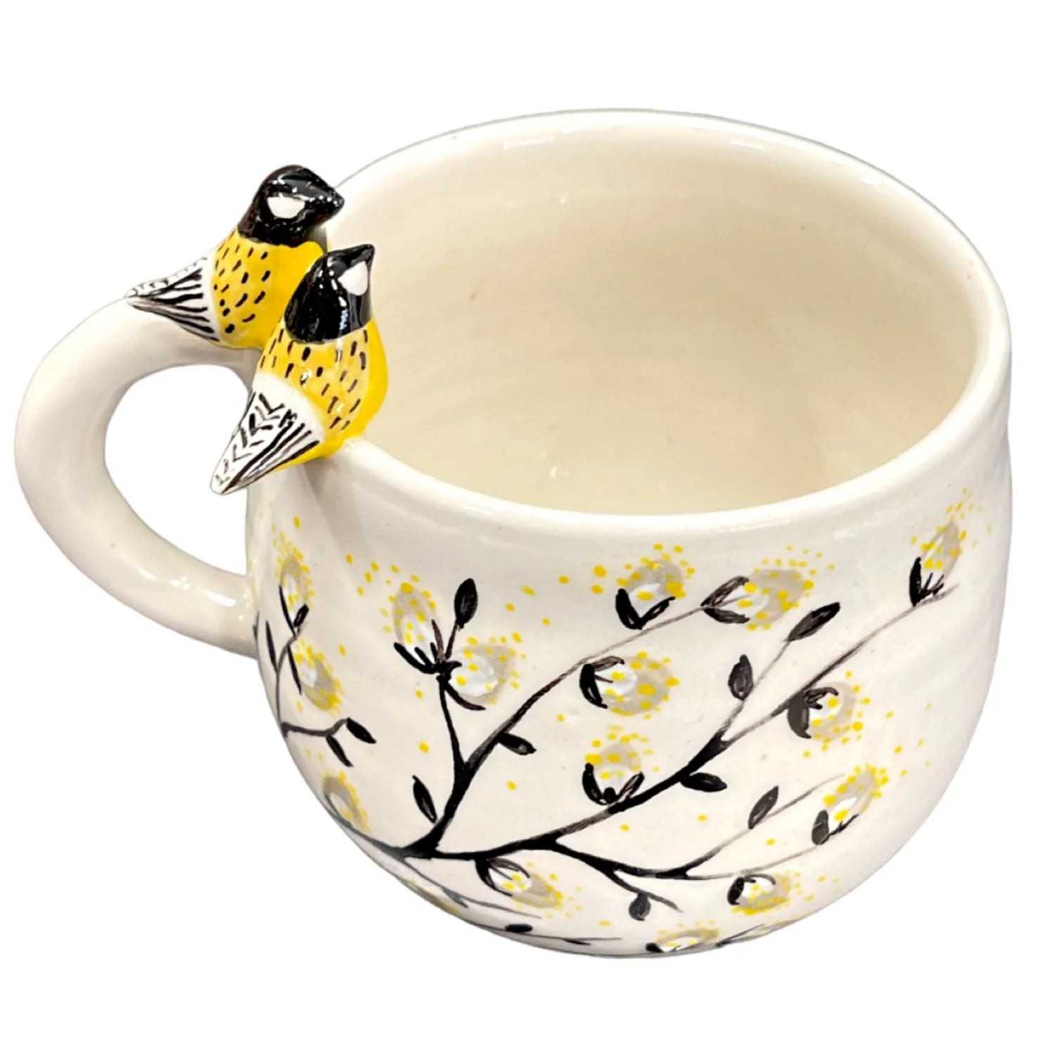 Керамическая кружка ручной работы, расписанная вручную, украшена рисунком из веток с маленькими желтыми цветочками. Особую прелесть кружке придают две фигурки синичек, расположенные на горлышке.