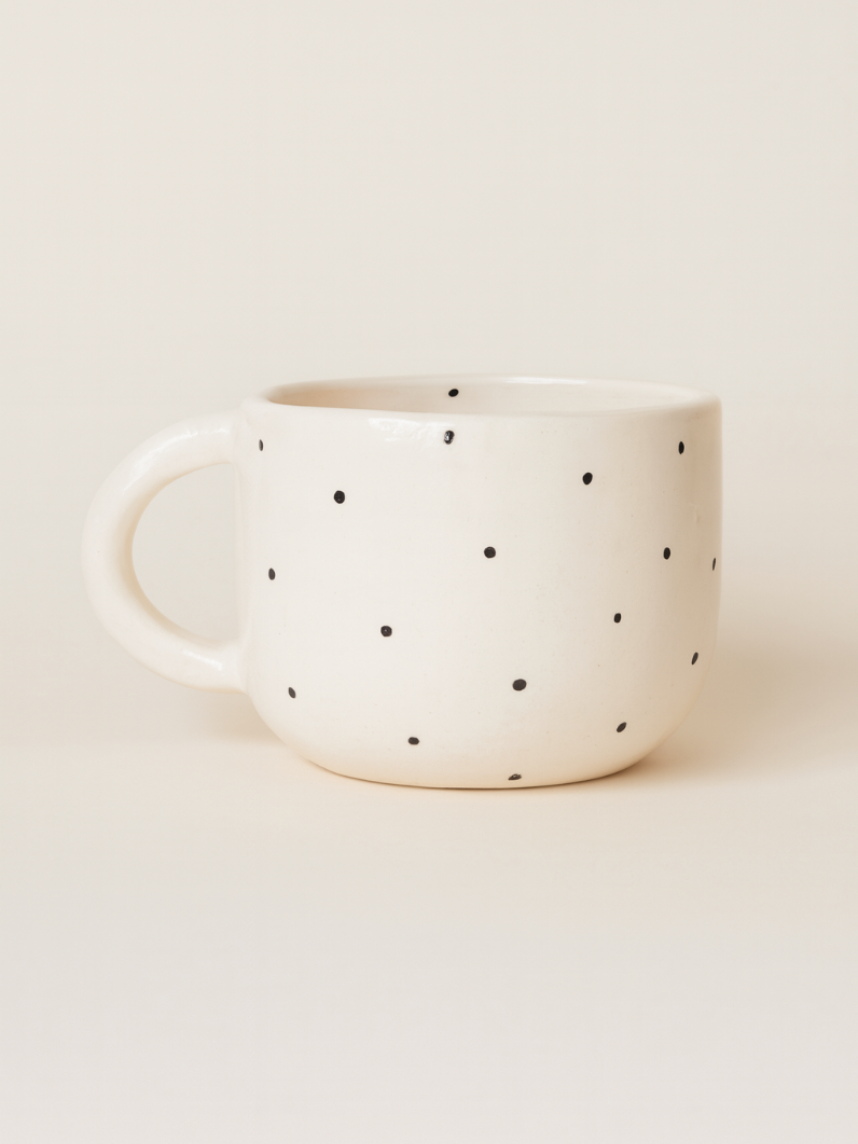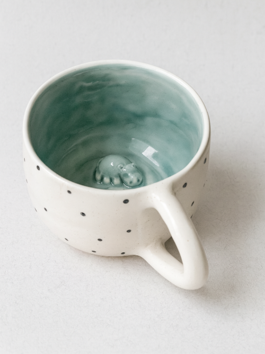 Данная кружка уникальна своими деталями: внешняя сторона кружки белого цвета в чёрную точку, а внутри, на дне, красуется фигурка бегемотика. Роспись выполнена в нежном голубом тоне, что придаёт кружке особый шарм и очарование.