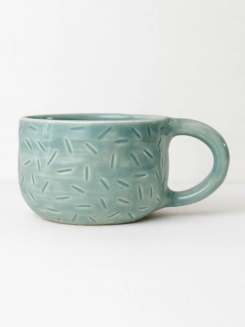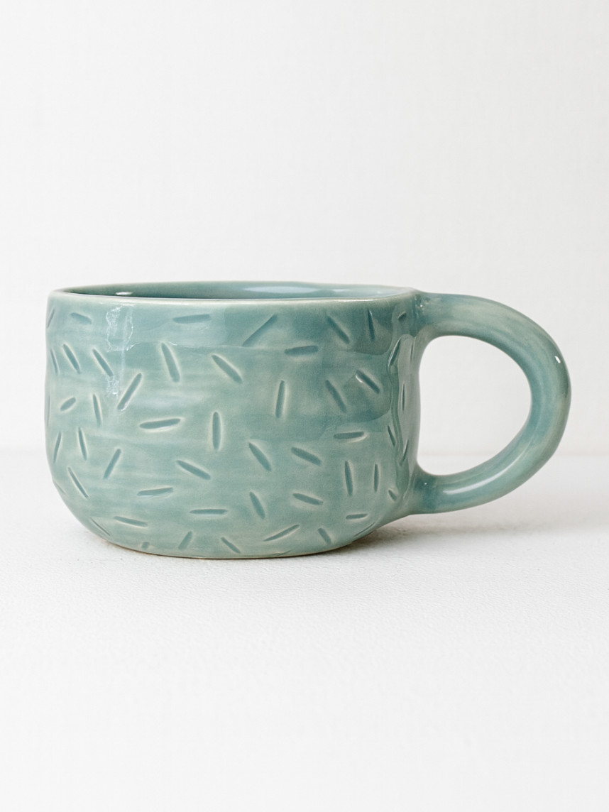 Кружка ручной работы выполнена из керамики и расписана вручную. Кружка снаружи тёмно-зелёного цвета. Особенностью этой кружки является фигурка крокодила, расположенная на дне. Ручная роспись делает каждую кружку уникальной и неповторимой.