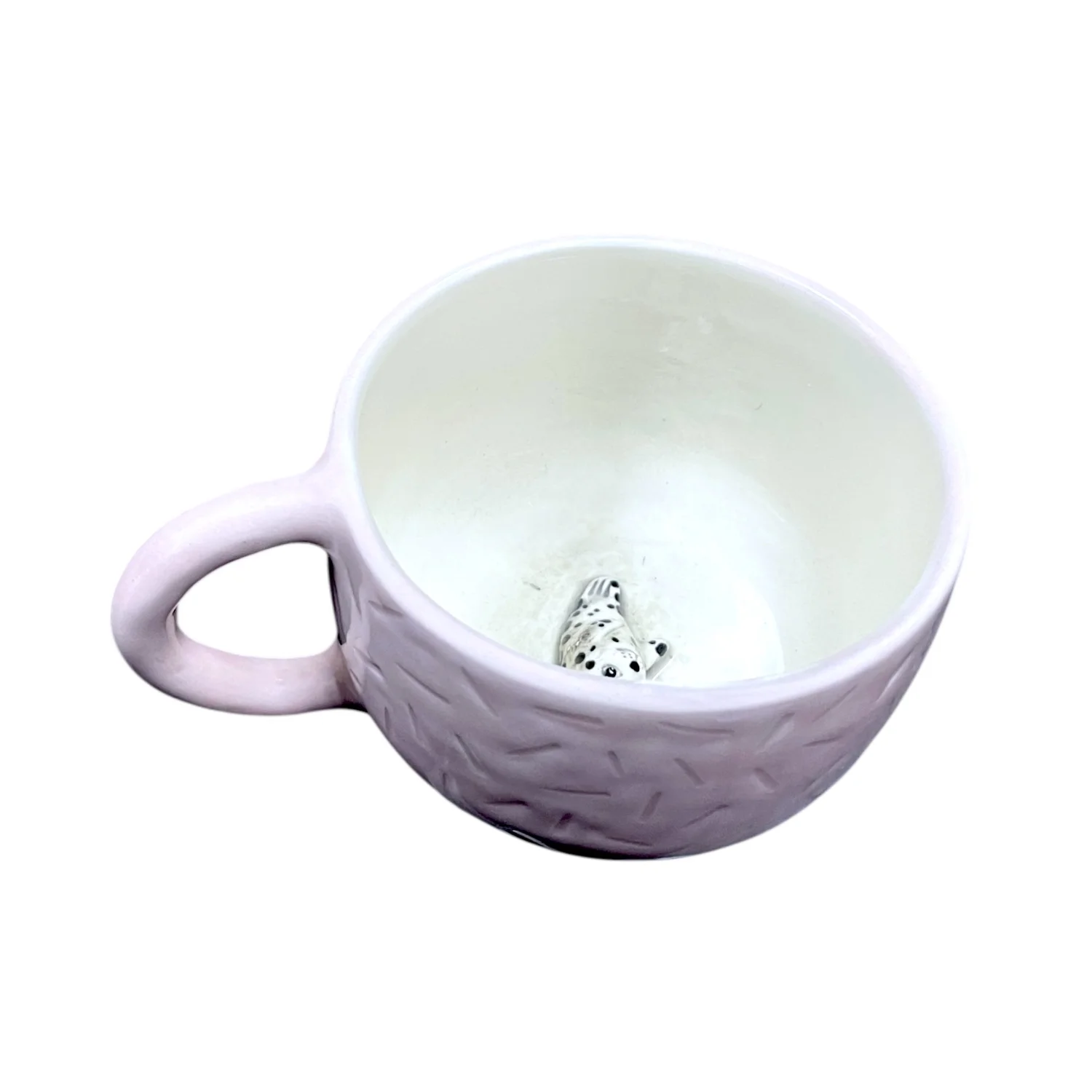 Кружка ручной работы выполнена из керамики и расписана вручную. Кружка снаружи розового цвета. Особенностью этой кружки является фигурка тюленя, расположенная на дне. Ручная роспись делает каждую кружку уникальной и неповторимой.